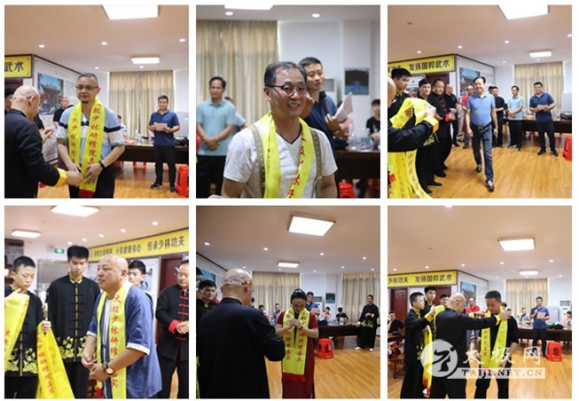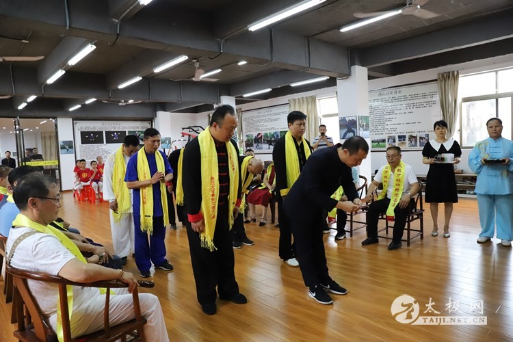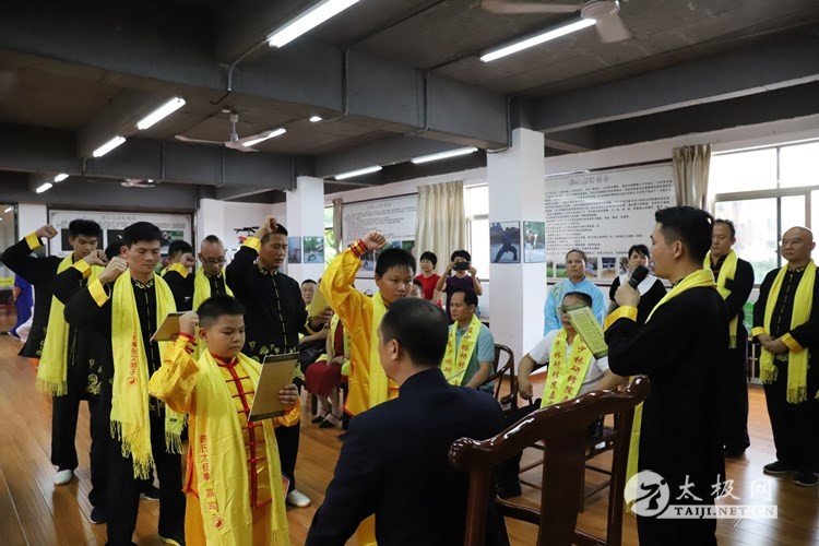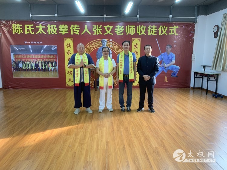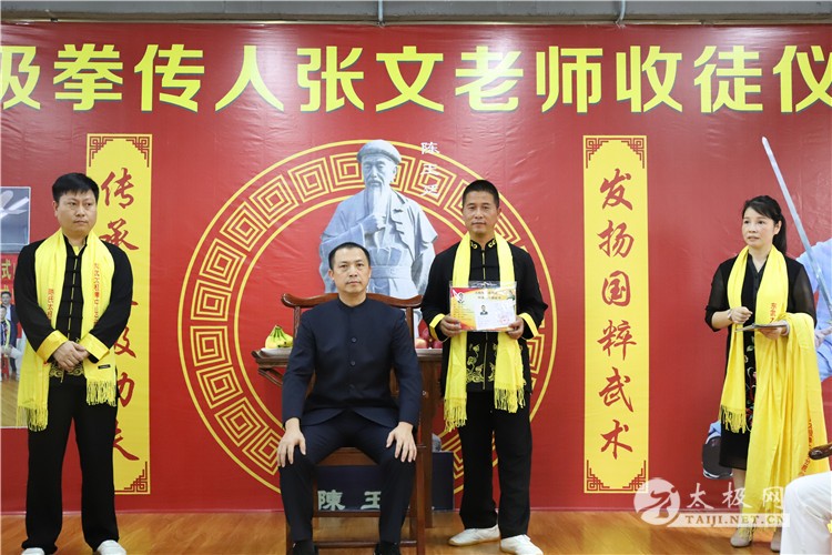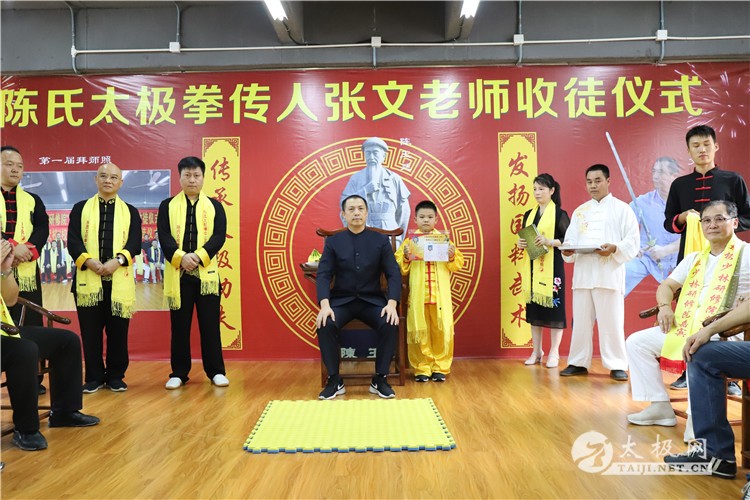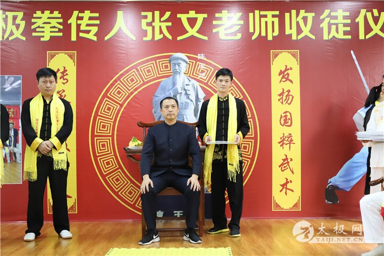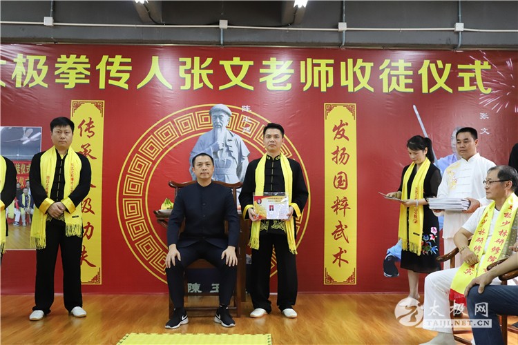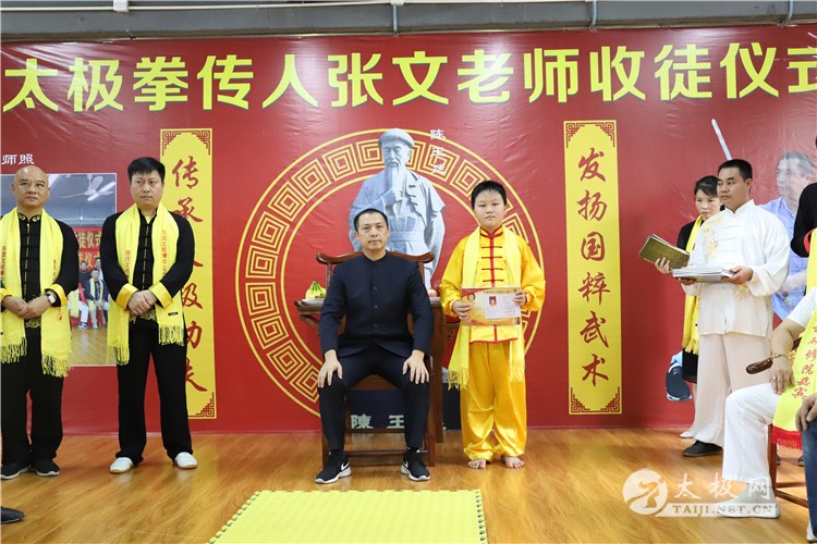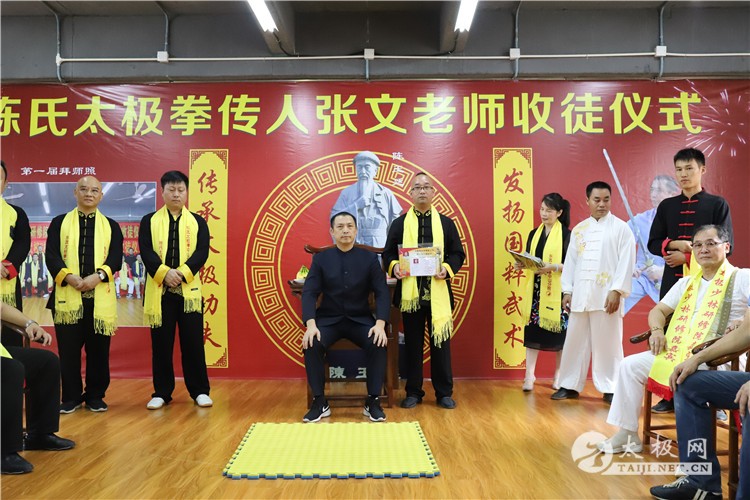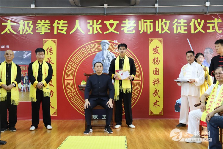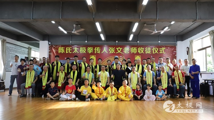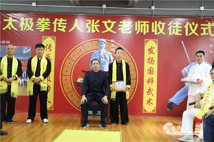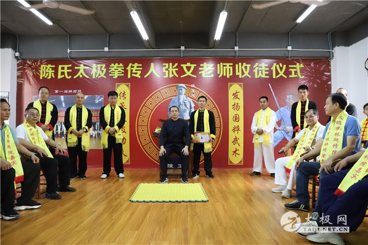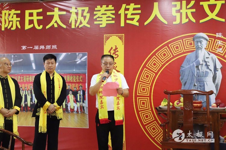 (太极网讯)太极根源陈家沟,薪火传承遍全球!7月29日下午,太极拳文化传承又迎喜事,陈式太极拳第十三代传人张文收徒仪式于广东省中山市太极少林研修院隆重举行。薛松杰、黄健鹏、吴智雄、付俊豪、梁少锋、朱雪超、赵宸贤、王柏钧、梁卓儒、乡爱民、付德华十一名太极拳爱好者经过重重考核如愿拜师,成为太极拳传人,肩负起弘扬传承太极拳之责任。 佛山市南海区武术协会毕全贵副主席,海灯法师关门弟子王春风大师,中山市家具商会李剑文会长,广州宝莲禅寺释延隆大法师,深圳市龙华新区太极协会杨宝忠会长,广东东武太极联谊会谢桂松执行会长,东莞市太极协会何和章副会长,阳西东武太极研修院罗妙丽院长,少林寺师兄弟陈志东、王新华、全康连、许晓敬,太极少林研修院名誉院长梁锦联先生,太极少林研修院名誉院长周辉先生,武当派太乙门20代传人徐兴光老师等应邀出席,共同见证这一庄严时刻。 仪式由深圳市龙华区太极协会会长杨宝忠主持。收徒仪式庄重古朴,由张文老师带领第一届所有弟子向祖师爷鞠躬,以告太极传承再续薪火。新入门弟子依次向师父行拜师礼、递交拜师帖、敬拜师茶,黄健鹏带领新入门弟子作新入门宣誓,在众人的见证下,收徒仪式圆满礼成。 张文老师向出席仪式的嘉宾表示感谢,他希望弟子尊守国家法律法规,尊师重道,尊重同行,讲武德,讲信用,团结拳友真诚对待自己师兄弟,勤奋刻苦练好拳之外,并要负起传承和发扬太极拳的义务,让太极事业发扬光大,积极响应太极少林研修院的口号:“研修太极精髓,分享健康身心,传承少林功夫,发扬国粹武术。” 见证人佛山市南海区武术协会副主席毕全贵对本次活动的隆重举行和张院长收得满意徒弟表示热烈的祝贺,同时对学生张文能在武术界取得如此令人瞩目的成绩表示祝贺,对自己能有如此优秀的学生感到自豪,并祝愿中华传统武术文化事业蒸蒸日上! 新入门弟子表示:能拜入张文老师门下深感荣幸,今后会将太极日常化,工作生活中借鉴太极的运动方式,化太极的一着一式为生活中的站、行、坐、卧,以四两拨千斤,化腐朽为神奇,让精神和状态彻底融入太极的奥妙。 海灯法师关门弟子王春风大师为此次收徒仪式作收官致词,他非常高兴,徒弟张文能收得高徒,希望他能再接再厉,广交善结,不断攀登武文高峰,并希望众弟子尊师重道,团结互助勇往直前! [ 释延隆大法师表演气功碎水杯为晚宴助兴 师徒合影 张文,陈式太极拳第十三代传人,师承太极拳名家张东武,1992年毕业于河南大学少林武术学院,中国武术教练员、陈式太极拳高级教练,现任茂名市宏峰国术馆名誉馆长、深圳市陈家沟太极拳研究院名誉院长、东莞市陈氏太极举协会名誉会长。2005年初投资陈家沟太极拳馆深圳分馆,2018年春在恩师张东武夫妇的大力支持下创办了太极少林研修院和东武太极研修院中山分院,同时任院长兼总教练。