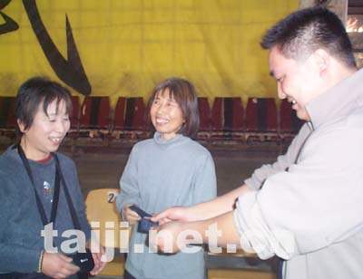今天中午,来自日本的两位太极拳爱好者莅临温县。在参观了太极拳发源地——陈家沟以后,来到温县太极武术馆太极培训中心观看正宗的太极拳表演。在校长陈二虎先生安排下,温县太极武术馆太极培训中心的学生们为日本客人表演了传统的陈氏太极拳老架一、二路、单刀、单剑、十三枪及推手。表演之后,两位客人又要求陈校长为她们校正单剑、新架一路的动作。随行的郑州领队因没见过真正的太极功夫,要亲自和学生们一试身手,结果被频频发出。