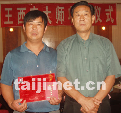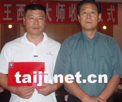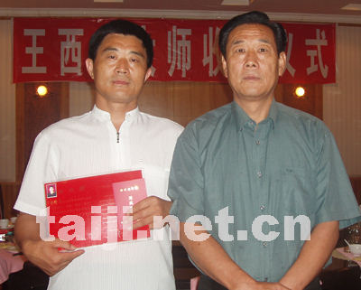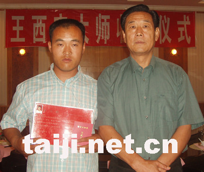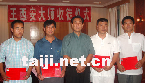 6月25日,王西安大师收徒仪式在温县银苑大酒店举行。李天金、张扬成、王春礼、刘正武自从跟随太极大师王西安学习太极功夫以来,得到王西安大师的悉心指点,严格教诲,几人在太极拳艺上成绩斐然。为表达对恩师的情意,四人自愿拜在王西安大师门下。四人之中,除了李天金是温县人以外,其佘三人均为江苏淮安人,虽然远隔千里,但凭着心中对太极拳的热爱,几年前不远千里来到陈家沟求拜名师,学习太极真功。