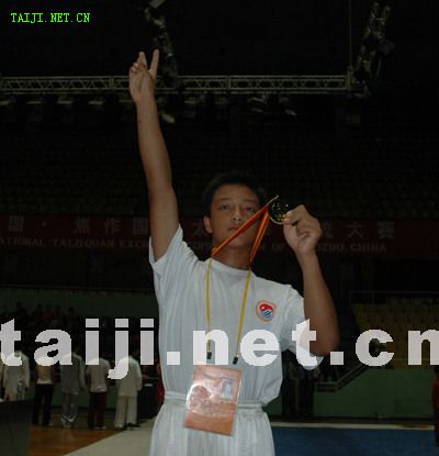 8月的温县天气很热,他的运动量又比我们成年人大好几倍,不一会他的衣服就湿透了,拧出了水。他的特殊习惯就是每练一套拳之后,就用洁白的牙齿咬一下湿透的衣服,感觉很好玩……。后来问了他才知道是咬牙坚持练下一遍。 我这年过半百的人出于好奇心,利用休息时间我们进行了初次相识的交谈:他“1991年出生,13岁了,河南焦作市人,陈式太极拳第二十代传人,2000年跟从陈式太极拳第十九代传人王西安学习演练太极拳。现在焦作市焦东路小学毕业了,学习成绩10名以内。2002年5月所写的“太阳公公的信”一文获第九届全国万校小学生作文竞赛二等奖;同年6月参加焦作市少年儿童综合素质展示大型联谊会被团市委评为“才艺少年”;又在9月份参加了中国焦作第二届国际太极拳年会获传统套路陈氏拳优秀奖、太极剑表演奖;结束后在10月份参加中国文化艺术发展促进会第九届全国推新人大赛,少年武术总决赛以第一名荣获“全国优秀新人奖”。所以说2002年是他文武双丰收的一年。 在2005年他参加第二届亚太武术比赛,荣获陈式拳二路第一名,新架一路第二名。在拳技上有了新的长进。2004年4月获得温县第十届太极拳剑、推手比赛太极拳第二名,剑第四名。5月份又获河南省“武协杯”传统太极拳交流大会暨陈家沟太极拳邀请赛太极拳第七名,短器械第八名。在放暑假前6月份写得“有趣的梦”一文荣获第四届“中华杯”全国小学生作文大赛三等奖。 学习班结束后,我们各自回到家乡。一恍我们一年没有见面了,今年来焦作观看比赛,在体育馆里我有点认不出他了,个子长高了一头多,双眸黑又亮,身穿白色绣龙特制赛场上唯一“望子成龙”太极服。是他妈妈精心设计的,样式很新颖。把东方传统美和西方现代时尚有机结合一起,有着独特的风格,龙飞凤舞,如同画卷,美感很强。展示出英俊少年的潇洒,风度翩翩,很有气质。就像一棵小松树,在阳光雨露下茁壮成长。我真羡慕这一代人赶上了我们国家处于这样的大好形势,美好时光…… 这时他妈妈赶过来说:“2004年10月份他参加首届世界传统武术比赛,获得男子A组太极拳一等奖,剑二等奖。明天2005年8月22日将参加第三届中国焦作国际太极拳年会,男子B组的比赛”。此组精英多,竞争强,含金量高。在22—23日两天的拳剑比赛中验证了这一事实。