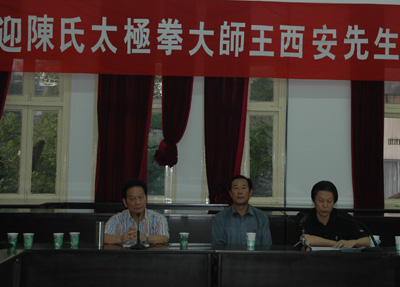 王西安老师是陈式太极拳第十九代传人,被誉为陈式太极拳“四大金刚”之一。王老师自幼在太极拳发源地-----陈家沟练武,先后师从太极名家陈照丕,陈照奎,深得太极真传,其太极功夫达到了炉火纯青的境界。其本人及手下弟子曾多人多次获得全国及国际太极推手冠军,并在国际拳坛上一直处于不败之地。 王老师曾多次出国传授拳艺,在国外受到过法国总理希拉里的接见,到日本皇室作过客,被日本大阪市授予“名誉市民”等称号,王老师精湛的拳艺,为太极拳赢得了国际名声,为推广太极拳作出了突出的贡献,国外媒体称誉他为“国际太极拳王”。王老师不仅武功好,其武德令人尊敬,为了使中国武术后继有人,王老师谢绝国外的聘请,最终选择在陈家沟创办武校,传授正宗太极。王老师和温州也很有缘分,其撇开门户之见,几次到温州来授拳,无私传授正宗太极,温州许多人,包括我在内,从王老师处均收益非浅。 中华武术是中国民族的传统文化,武术万法归宗,太极是其最高境界。我一直认为,太极是阴阳,太极是四象,太极是八卦,太极是五行,太极是“一”,太极是道。太极是哲学,太极是美学,太极是医学,太极是社会学,总之,太极包罗万象。真正学好,学懂太极,是一件非常不容易的事情。当然,古人把拳术命名为太极拳,更有其深刻的含义。太极拳不仅是强身健体的有限手段,而且包涵了非常深奥的道理,是中国传统文化的精髓之一,非常值得我们后人将其发扬光大。太极拳作为中华武术的一种。在古代曾起过安邦定国的作用,同时其丰富的内涵与时俱进,非常符合新时代的要求。太极拳讲求内外兼修,阴阳和谐,万疾不侵。现代提倡个人要和谐,家庭要和谐,社会要和谐,这就是太极阴阳和谐所追求的目的。太极追究的和谐理念,无疑对目前提倡的构建和谐社会也有积极的意义。现在全世界有一亿人练习太极拳,许多外国人,甚至不远万里,到中国,到陈家沟,拜师求艺学习太极正宗,他们中许多人就是拜在王老师的门下。这次王老师到温州,是温州武术界的幸事,是温州广大爱好者的幸事,希望广大爱好者珍惜这次机会,同时希望王老师在温州多看看,多走走,感受一下改革开放后的新温州,新形象。 最后,再次欢迎王老师的到来,希望王老师在温州路途愉快!