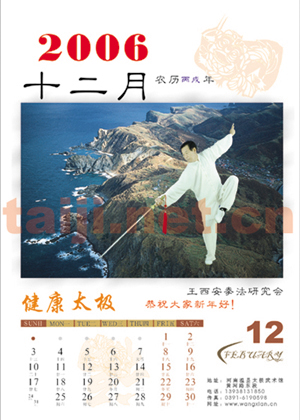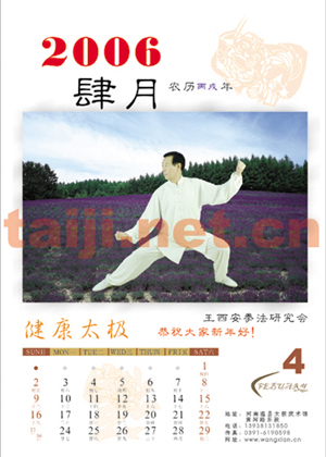 值2006年新春佳节到来之际,王西安拳法研究会首次制作了太极大师王西安先生太极拳照挂历和明信片,做工精良,制作考究,是馈赠拳友、自己欣赏和收藏的最佳选择。数量有限!欢迎广大太极拳爱好者订购! 挂历价格:45元/本(含邮资) 明信片:1.6元/枚,一套15枚(邮寄另付邮资5元) 地址:河南省温县太极武术馆 收款人:阎素杰 电话:0391-3339877 手机:13938131850 邮编:454850