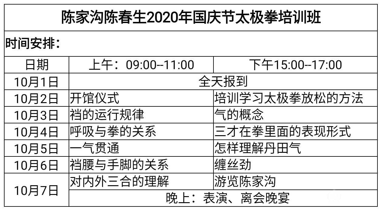 致广大太极拳爱好者: 传承太极技艺,弘扬太极文化!2020年10月1日至7日,陈家沟陈氏太极拳小架代表性传承人陈春生将于太极拳发源地举办陈氏太极拳小架培训班,旨在高效利用节假日切实提升太极拳爱好者的技艺习练水平,秉承拳理翔实、功法古朴的教学原则,利用拳的每一势来阐述外形与内在的结合、裆腰的运行规律、呼吸与拳的关系等练拳的规矩。 数十载扎根太极故里,坚守太极传承,届时陈家沟春生太极院将正式举行开馆仪式,欢迎广大拳友前来学习交流! 具体事项通知如下: 一、10月1日在陈家沟春生太极院报到。 二、培训地点:河南温县陈家沟春生太极院。 三、培训班费用说明:每人2680元,包含食宿、太极服一套,报名时请说明身高、体重。差旅费用自理。报名截至9月26日。 四、为满足学员报名需求并保证培训效果,本次培训班限额40人,谢绝空降! 五、课程安排: