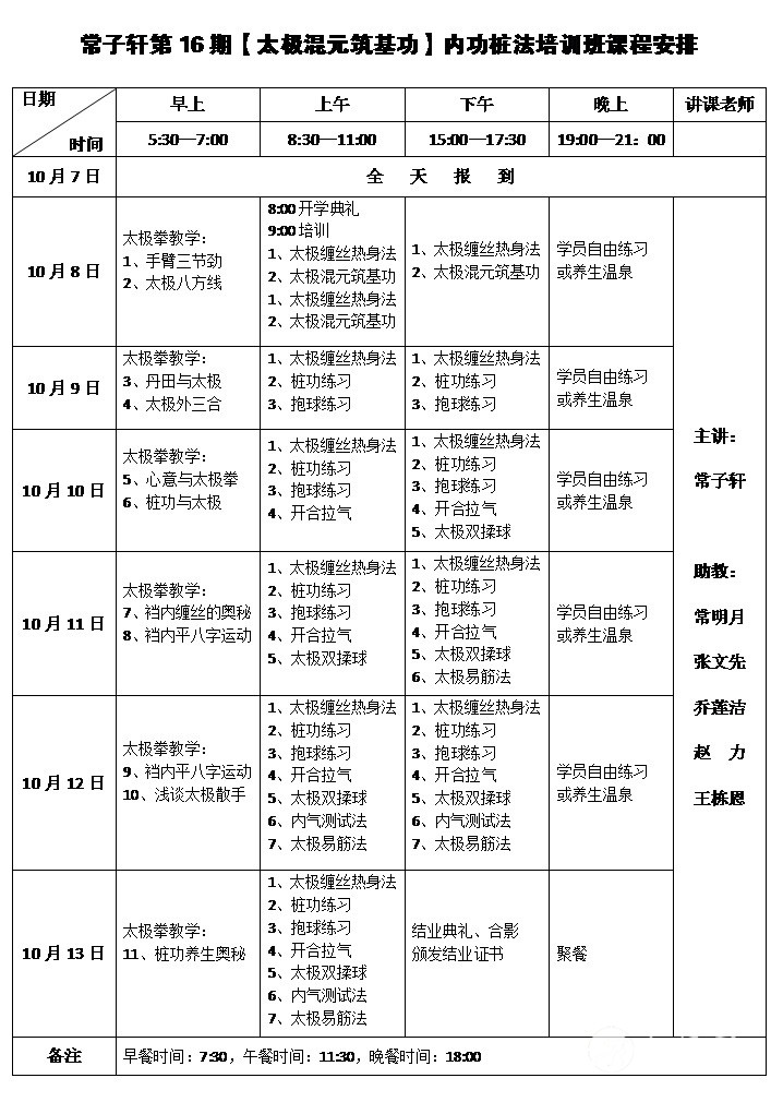太极混元筑基功(又名“太极内功桩法”,是太极拳散手战斗周身听劲的必修课程),该功法相传至今约有300余年,它顺遂宇宙自然理法,讲究天人合一。由于其得功快,气感强,功能奇特,历代都是师徒之间言传心授,从不外传,所以世人知之甚少。 通过太极混元筑基功的训练,不仅能够提高太极拳法的技艺,并且从调身、调气、调息都有其独到之处,在健身养生、调疾祛病、益寿延年方面有神奇的功效。常子轩老师第16期【太极混元筑基功】内功桩法培训班将在温县海旺弘亚温泉大酒店进行。 具体安排如下: 一、【培训时间】 2020年10月8日至10月13日共计6天。2020年10月7日全天报道。报道地点:温县海旺弘亚大酒店。 二、【培训内容及日程安排】 三、【结业】 1. 此次培训结束后颁发常子轩太极拳研修院结业证书。 2. 累计参加三次常子轩老师的桩功培训班,经考核合格后,可颁发由陈家沟太极拳推广中心认证的“太极混元筑基功内功桩法教练资格证”。 四、【费用】 1. 学费:2380元/人。费用包含:学费、服装费、资料费及人身意外险(10月6日—10月15日)等;费用不含:食宿、往返交通及收费包含项目之外的其他个人消费。 2. 优惠: a. 【老常草堂话太极会员】报名优惠180元; b. 【常子轩太极拳研修院终身荣誉学员】报名享培训费8折优惠。 注:以上优惠条件不可叠加,报名即送亚麻太极服一套。 3. 食宿标准: 标准间(两人同住):188元/人/天(含住宿、早中晚餐及一次温泉) 单人间(一人住宿):268元/人/天(含住宿、早中晚餐及一次温泉) 注:随班食宿统一安排为标间,有特殊要求的请提前告知。 4. 汇款办法: 银行汇款:户名:乔莲洁 农行卡号:6228482371111691914 支付宝账号:mzyatou@126.com 乔莲洁 微信转账微信号:13462832523 乔莲洁 五、【报名方式】 1. 报名联系:乔老师,13462832523(微信同号)。报名截止日期:2020年9月30日。 2. 报名时需提供姓名、性别、年龄、身高、体重、联系方式、身份证号等信息。 六、【注意事项】 1. 此次培训为VIP小班制,仅限35个名额,额满即止。 2. 参加人群: 仅限国内非疫区健康码绿色人士参加,要求一个月内未到过疫区、没有出境史。 3. 转账成功后请联系乔老师予以确认。 4. 请自备口罩等防疫用品。 5. 如因疫情反弹等不可抗力因素造成培训延期开展的,开班时间另行通知。 往期桩功培训掠影 ▼ 酒店环境 ▼ 本站编辑:太极网安安 |