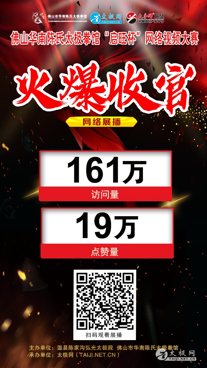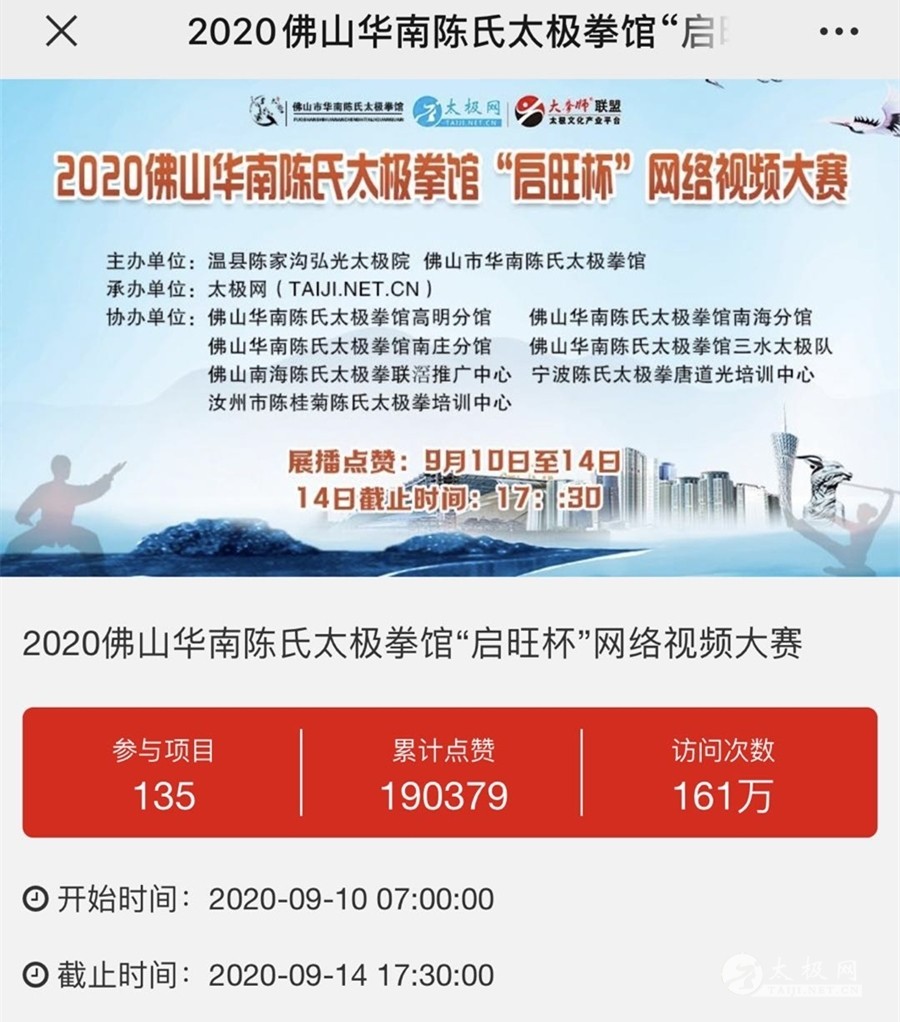 (太极网讯)为纪念华南陈氏太极拳馆成立20周年,宣传和展示拳馆多年教学成果,感恩陈启旺太极体系文化传承,传播太极正能量,由温县陈家沟弘光太极院、佛山市华南陈氏太极拳馆主办,太极网承办,联合相关友好合作单位发起2020佛山华南陈氏太极拳馆“启旺杯”网络视频大赛,共有135部参赛作品参加了此次网络视频大赛。9月14日下午,2020佛山华南陈氏太极拳馆“启旺杯”网络视频大赛经过5天持续高能燃烧圆满收官。 大赛全体同台展播点赞从9月10日,截至14日17:30收官,平台累计网络访问量161万次,投票点赞19万次,广大朋友们互动留言频繁刷屏,连续5天燃爆武术人的朋友圈! 赛事由选手线上报名、线下录制参赛视频、在线展播、在线投票、专家评审、颁奖典礼等环节组成。广大太极人踊跃互动交流,好评如潮。