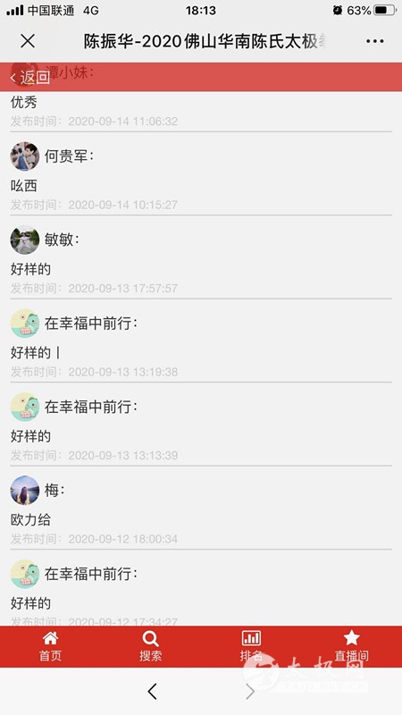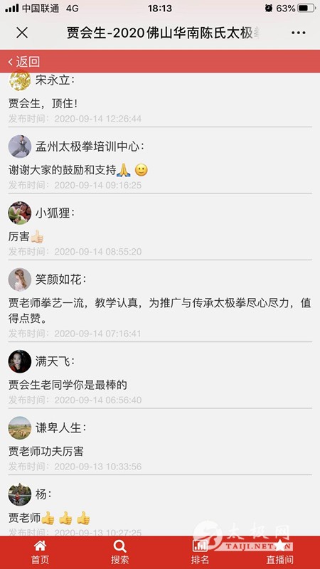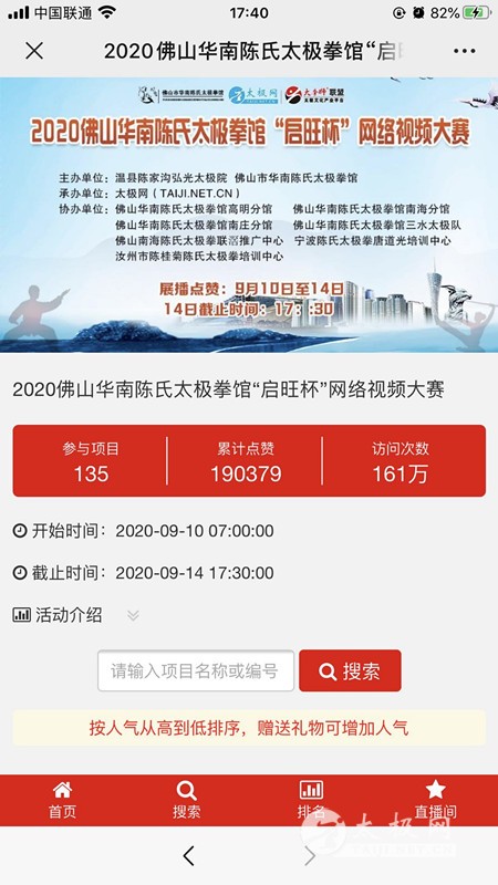 为纪念华南拳馆成立20周年,宣传和展示拳馆多年教学成果,感恩陈启旺太极体系文化传承,传播太极正能量,由温县陈家沟弘光太极院、佛山市华南陈氏太极拳馆主办,太极网承办,联合相关友好合作单位发起2020佛山华南陈氏太极拳馆“启旺杯”网络视频大赛,赛事由报名、录制参赛视频、在线展播及投票、专家评审、颁奖典礼等环节组成。 大赛全体同台展播点赞从9月10日开始,截至14日17:30收官,平台累计网络访问量161万次,投票点赞19万次,广大朋友们互动留言频繁刷屏,连续5天燃爆武术人的朋友圈!