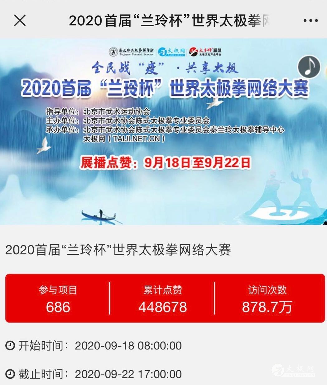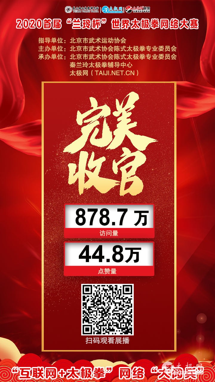 北京市武术运动协会陈式太极拳专业委员会秦兰玲太极拳辅导中心、北京市武术运动协会华城武术专业委员会玉渊潭辅助站、北京武魂武道武术培训基地秦兰玲辅导站、海南省三亚市武术协会秦兰玲太极拳辅导中心、黑龙江省武术、太极拳协会海南分会秦兰玲太极拳辅导中心、北京市海淀区甘家口街道太极拳协会秦兰玲太极拳辅导中心,自2008年在华城武术社建站以来,以“学练传承,弘扬普及,健康快乐”为宗旨,积极参加公益活动,在国内外传播、推广、教授、辅导太极拳,为弘扬中华民族优秀的太极拳文化,助力“全民健身活动”做出了积极努力。 当前全球处于共同战“疫”时期,为积极响应发展全民健身、建设健康中国的政府号召、响应国家体育总局关于居家科学健身,举办网络赛事的号召,秦兰玲太极拳辅导中心与太极网联合发起举办2020首届“兰玲杯”世界太极拳网络大赛,弘扬太极正能量,为传承推广太极拳贡献力量。北京武术运动协会大力支持本次赛事,特下发文件,指导赛事相关事项。 大赛视频展播点赞环节从9月18日开始,截至22日17:00收官,平台累计网络访问量878余万次,投票点赞44余万次,广大朋友们互动留言频繁刷屏,连续5天燃爆武术人的朋友圈! 赛事以《全民战“疫”·共享太极》主题,依托“互联网+太极拳”传播手段,创新武术传播模式。由选手线上报名、线下录制参赛视频、在线展播、在线投票、专家评审、颁奖典礼等环节组成。686部参赛作品,千万朋友踊跃互动交流,盛况空前,好评如潮。 大赛评审结束后统一公示成绩,届时大赛组委会还将发布本届大赛颁奖典礼等线下主题活动通知,期待朋友们以网会友、以武会友,交流、交心、交朋友。 本站编辑:太极网安安 |