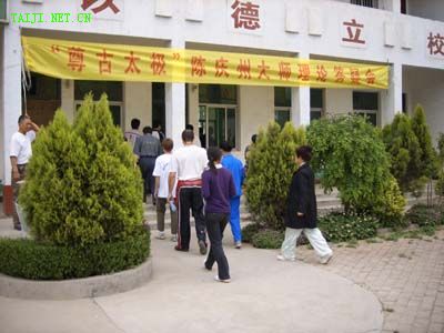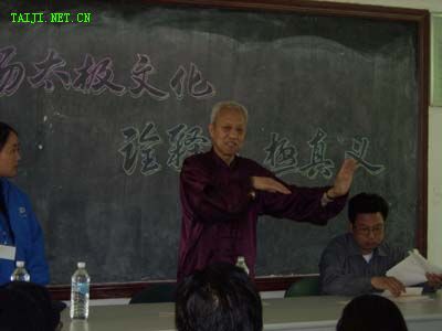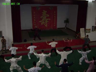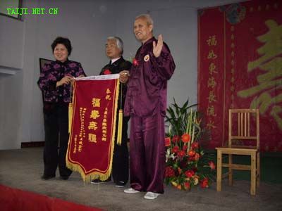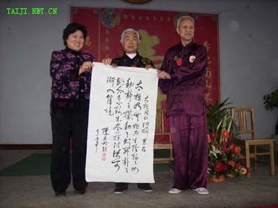 陈庆州教学中 中午11点30分,为陈大师举行了贺寿仪式,庆祝陈庆州大师七十二岁寿辰,其间,国际武术联盟总会副会长、荷兰王国太极气功健身中心主任王琰女士为陈大师赠送了锦旗,以示祝贺,陈大师回赠其书法作品。整个仪式场面热烈,气氛和谐。