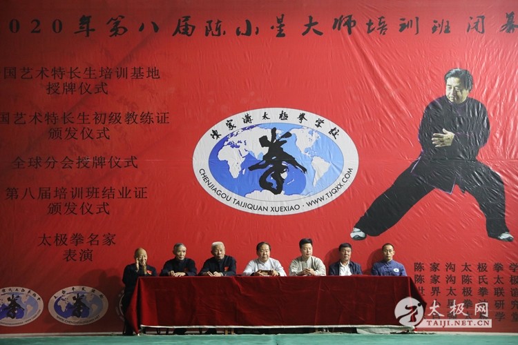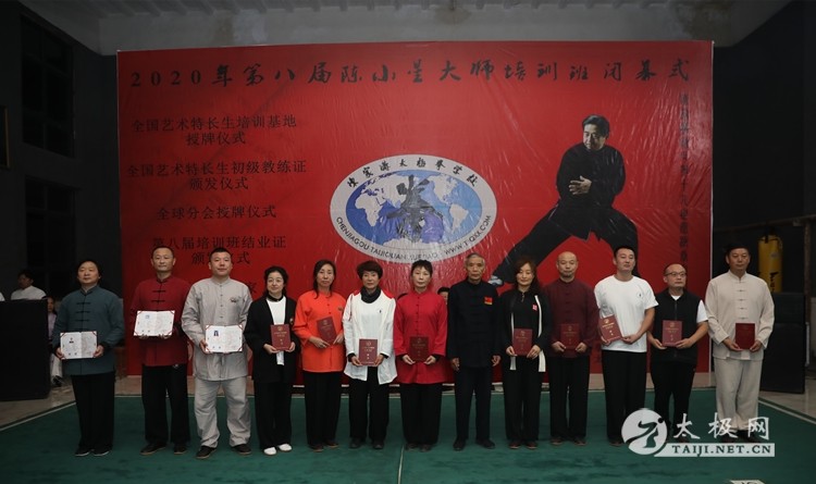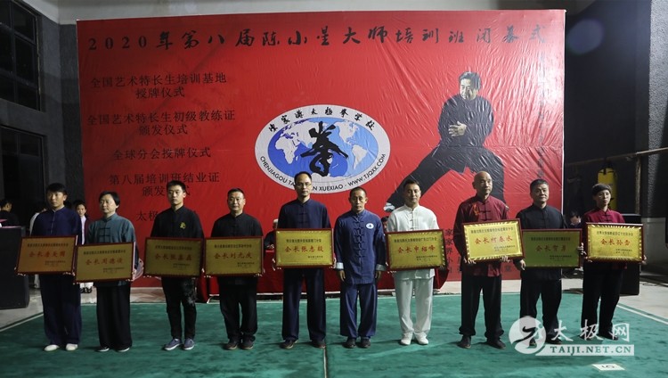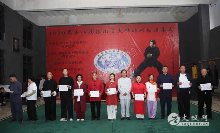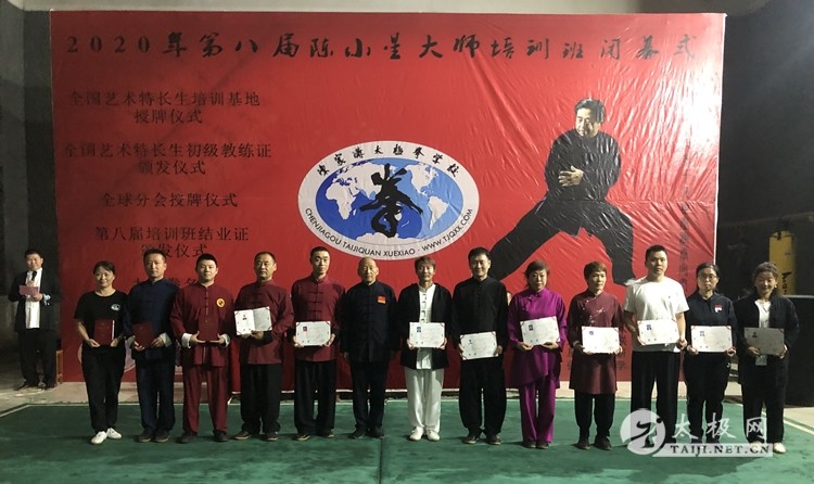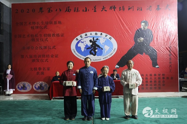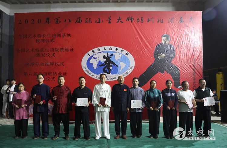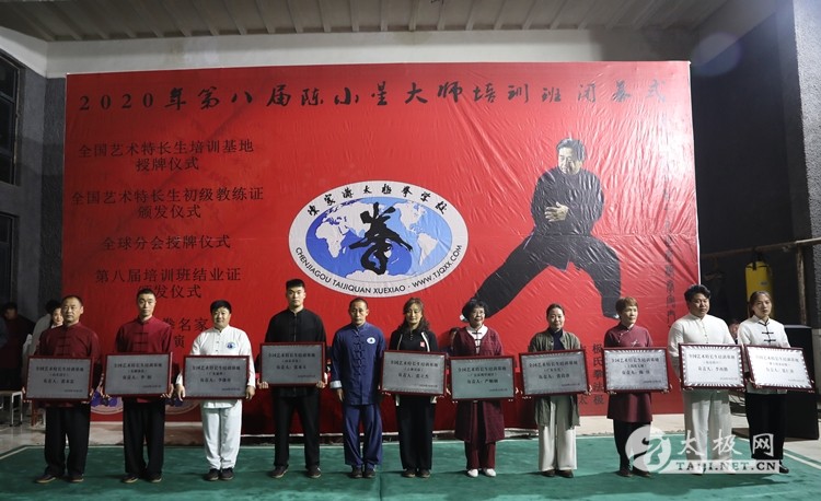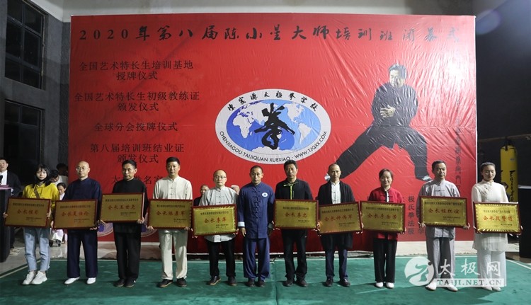 (太极网 讯)10月5日,2020年第八届陈小星大师培训班学员们经历了三天的紧张学习正式结业,来自全国的太极拳爱好者们,通过考核,全部顺利的拿到结业证书,3天时间里大家和陈小星老师零距离接触,相互切磋交流学得技艺,收获满满,培训班闭幕式于陈家沟隆重举行。在闭幕式上颁发了第八届陈小星大师培训班结业证书,全国艺术特长生初级教练证书,全国30家单位全国艺术特长生培训基地牌匾,29家陈家沟陈氏太极拳协会新分会牌匾,以及“陈家沟荣誉村民”证书,期间进行了精彩纷呈的名家表演。 陈家沟太极拳学校总教练陈自强、陈家沟村村长陈景元、陈家沟陈氏家族族长陈景安、陈家沟陈氏家族理事会主任陈一华、陈家沟陈氏家族理事会秘书长陈石岩、陈小星大师弟子代表杨宝骞、陈家沟荣誉村民冷喜武应邀出席闭幕式。 陈自强为全国艺术特长生培训基地授牌 陈景元为全国艺术特长生培训基地授牌 陈景元为全国艺术特长生培训基地授牌 陈自强为陈家沟陈氏太极拳协会新分会授牌 陈自强为陈家沟陈氏太极拳协会新分会授牌 陈自强为陈家沟陈氏太极拳协会新分会授牌 陈自强为许春来、凌承渝、王久荣颁发纪念礼品
