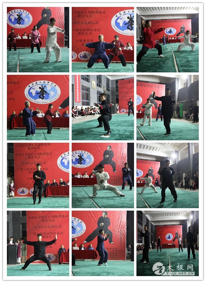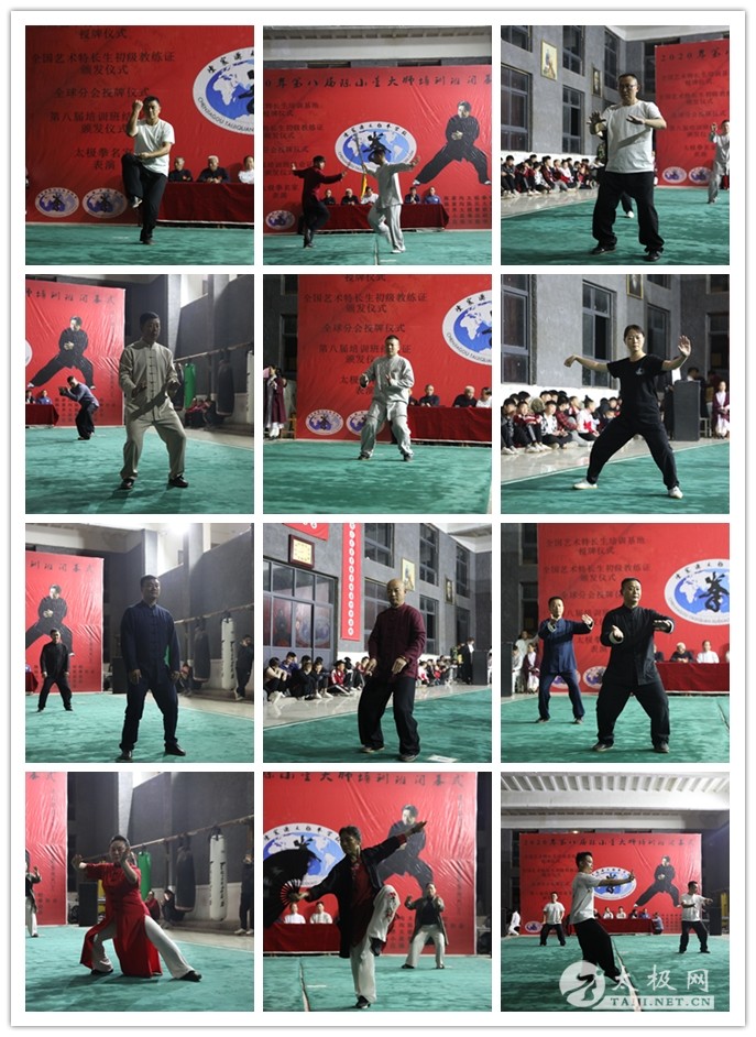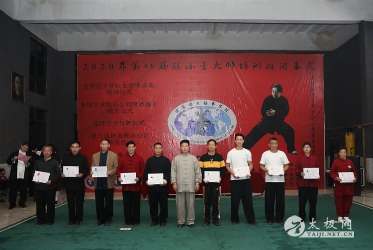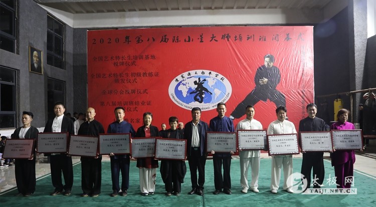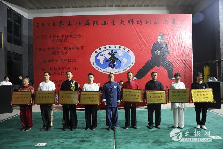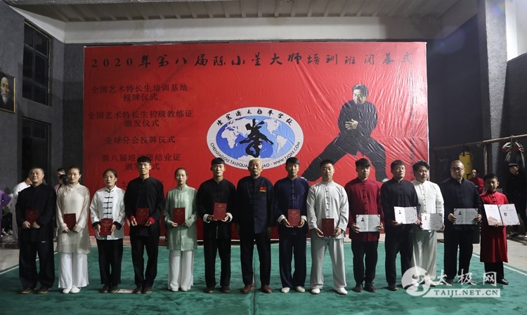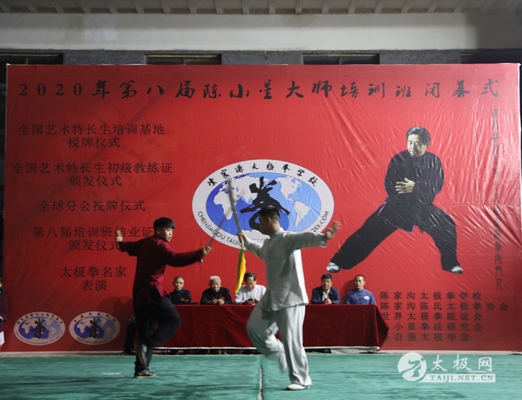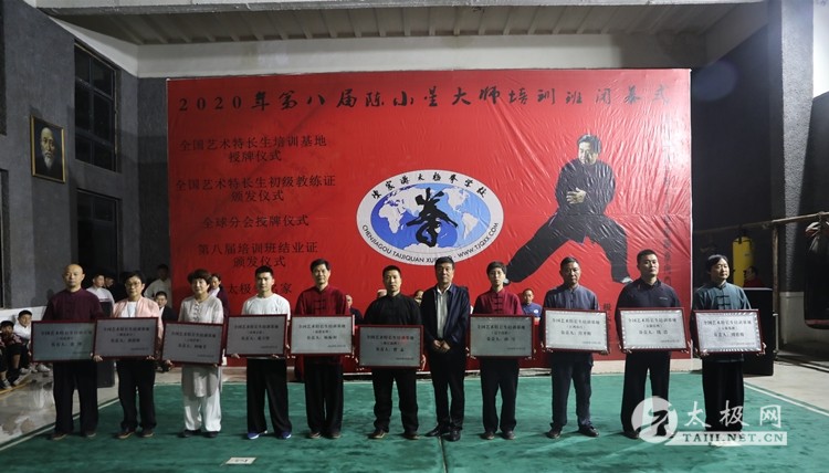 (太极网 讯)10月5日,2020年第八届陈小星大师培训班学员们经历了三天的紧张学习正式结业,来自全国的太极拳爱好者们,通过考核,全部顺利的拿到结业证书,3天时间里大家和陈小星老师零距离接触,相互切磋交流学得技艺,收获满满,培训班闭幕式于陈家沟隆重举行。在闭幕式上颁发了第八届陈小星大师培训班结业证书,全国艺术特长生初级教练证书,全国30家单位全国艺术特长生培训基地牌匾,29家陈家沟陈氏太极拳协会新分会牌匾,以及“陈家沟荣誉村民”证书,期间进行了精彩纷呈的名家表演。 陈家沟太极拳学校总教练陈自强、陈家沟村村长陈景元、陈家沟陈氏家族族长陈景安、陈家沟陈氏家族理事会主任陈一华、陈家沟陈氏家族理事会秘书长陈石岩、陈小星大师弟子代表杨宝骞、陈家沟荣誉村民冷喜武应邀出席闭幕式。 陈自强为全国艺术特长生培训基地授牌 陈景元为全国艺术特长生培训基地授牌 陈景元为全国艺术特长生培训基地授牌 陈自强为陈家沟陈氏太极拳协会新分会授牌 陈自强为陈家沟陈氏太极拳协会新分会授牌 陈自强为陈家沟陈氏太极拳协会新分会授牌 陈自强为许春来、凌承渝、王久荣颁发纪念礼品
