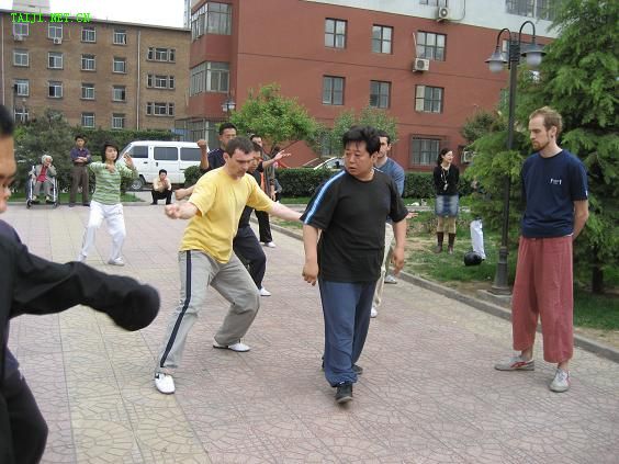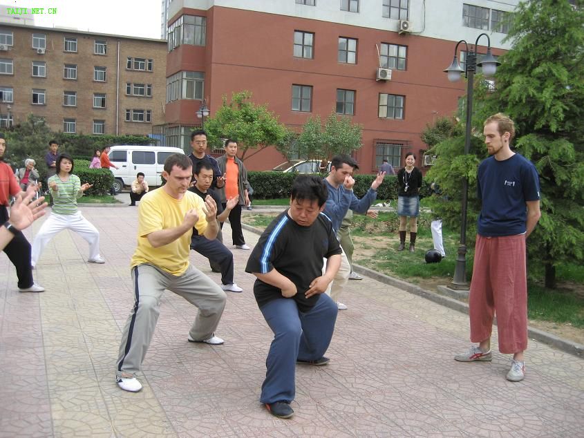 师父陈瑜先生平时说话幽默风趣,爱开玩笑,但是所有的师兄弟和学员们都知道,在教学现场,师父在教学过程中是一板一眼,绝对不能开玩笑,在06年五一培训现场,师父对学员一视同仁,不仅对国内学员严格要求,对国外学员也一样严格要求,甚至不放过一丝一毫的细节。 上面是师父的教学现场动态截图,师父陈瑜先生告诉学员们,即使是一个过渡动作,胯根也要沉下去。