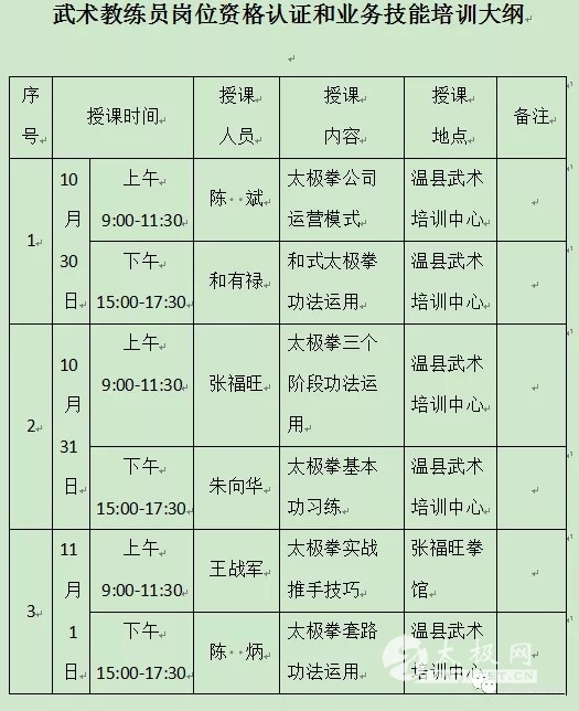 全县各武术馆校、武术社团: 自7月5日“武术人才及非遗物质传承人业务技能培训班”开办以来,深受全县各武术教练员的认可,也得到社会各界的肯定,由于前期受分配名额限制,不能满足更多人的学习需求,各武术馆校、社团的大部分教练员没能享有培训机会。为此,经温县太极拳武术文化管理中心和温县武术协会研究决定,扩大学习范围,不再受原有名额指标限制,自10月13日起重新报名。现将相关事宜通知如下: 一、报名条件 1.由各武术馆校、社团推荐,除7月5日开班以来,所分配名额外的16周岁以上学员均可报名。 2.现任各武术馆校、社团未获得教练员岗位证书的武术教练,并有县级及以上武术比赛相关成绩的。 3.热爱武术,武德良好,无不良记录。 4.温县武协会员(报名前还可申请办理)。 二、报名时间及人数 2020年10月13——29日,人数限定100名。 三、报名地点 携带相关证件(身份证、参赛成绩原件、县武协会员证)到温县武术协会(黄河路366号)报名。 联系人:朱苗苗 电话:13523346760 四、教练员岗位资格认证条件 1.保证培训时间,不得缺课。 2.学员培训结束后,需经统一考试合格。考试具体事宜另行通知。 3.同时具备以上两个条件的颁发武术教练员岗位资格证书。 五、培训时间及费用 培训时间:10月30日--11月1日 费用:资料费、证书制作费及工本费、考核费等共计200元。 六、要求 1. 高度重视,推优择优。本次武术教练员岗位资格认证业务技能培训是我县武术协会成立以来,开展的全面、系统而丰富的武术人才培训课程,是武管中心下一步对各武术馆校进行考核和年审的重要依据,希望各武术馆校和武术社团高度重视,积极推荐优秀人员参加。 2. 严肃纪律,高效学习。自10月30日开班后,各学员要严格执行考勤制度,严格考核管理,确保学习效果,确保考核合格。 温县太极拳武术文化管理中心 温县武术协会 2020年10月13日 培训大纲附后: 来源:拳乡之声 本站编辑:太极网安安 |