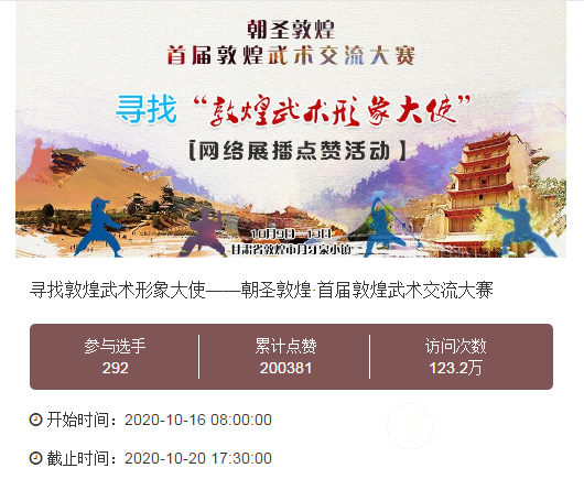 敦煌,自古以来是丝绸之路上的重要城市,东西方文明在此交汇融合,形成独特的敦煌文化。武术作为中国传统文化与非遗文化的杰出代表,与世界非遗文化代表地敦煌文化交相辉映。10月10日,在敦煌市委市政府的大力支持下,朝圣敦煌——首届敦煌武术交流大赛于敦煌月牙泉小镇隆重开幕,以武为媒赋能敦煌文旅融合,闪耀“文化圣殿 人类敦煌”!来自全国各地的三百余名武术爱好者们相聚在充满魅力的人文敦煌同台竞技,共襄武术盛会、朝圣之旅。 为进步扩大赛事影响力,传播和展示参会武术人风采,宣传和推介敦煌旅游风光。大赛结束后,组委会围绕大会主题发起“寻找敦煌武术形象大使”的网络展播活动。经广大太极拳爱好者点赞投票、互动留言、分享传播,组委会根据最终展播人气结合组委会专家评审,评选出一批敦煌武术形象大使,进一步扩大和提升敦煌文化与太极文化的融合宣传。让我们再次为荣誉获得者点赞! 经自主申报和组委会审核通过后,最终确定5人荣获“武术形象大使”,展播平台自10月16日上线后,瞬间引发广泛关注和强烈热议,广大拳友于平台频频留言互动,交流探讨,引爆广大太极人的朋友圈!经过5天的网络展播、点赞、互动,平台累计访问次数123万,累计点赞20万,精选留言万余条······ 现将2020首届敦煌武术交流大赛“武术形象大使”入围名单公布如下(排名不分前后): 尚德望军武世家,三岁半家传医武,聪慧刻苦又得名师指点,身历生死,儒相道骨。陈家沟太极拳二十世嫡宗传人。师承国际太极拳大师陈小旺,又得陈小星等大师悉心指导,深得陈式太极拳拳精要。中国武术七段。军警体系长年执教,随行领导出访各国。CQB专精,一招制敌专精,特警特战擒拿格斗术教官。驻外期间四次负伤,欧洲驻外维和特种部队军事基地某部授予空降兵银翼勋章。 陈向武 陈向武,出生于太极拳世家,陈家沟陈氏第二十世、陈氏太极拳第十二代嫡宗传人,师承其父陈东海。国际太极拳文化传播大使,国家武术七段,国家一级武术裁判,国家武术段位制指导员、考评员,汕头市非物质文化遗产保护工作专家委员会委员。太极网首席武术导师、国际太极拳网络视频大赛专家评委。现任陈鑫太极拳研究会会长、尚武太极拳馆全国总部馆长兼总教练、尚武太极拳俱乐部全国总部主席兼总教练。 王刚 王刚,兰州市人,中国武术六段、高级太极拳师、国际太极拳教练、社会体育一级辅导员、武术段位指导员、考评员。自幼醉心拳道,喜钻研武学,曾师从甘肃省太极拳协会会长刘建华为师,系统习练陈氏太极拳大架。后经刘建华推荐,拜在老“四大金刚”之一王雁宗师嫡孙王长江门下,钻研王雁传陈氏原貌传统架,经王长江师父悉数身传,其拳法更加严谨,发力日趋浑厚。 冯贵宏 冯贵宏,陈式太极拳第十二代传人,师承马虹。现任运城市武术协会副主席、运城市太极拳协会名誉主席、运城市太极拳协会税务分会会长。2017年和2018年度“最美太极人”。承德太极拳形象大使、丽江太极形象大使。