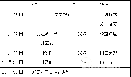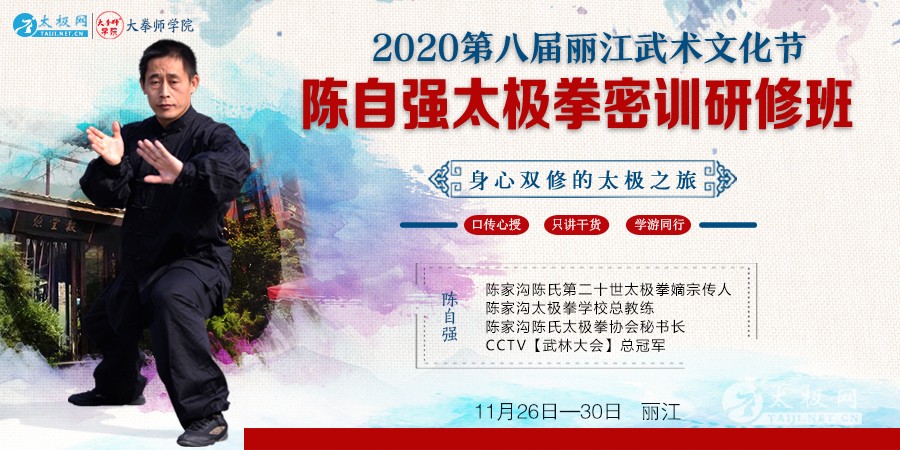 2020年第八届丽江武术文化节 陈自强太极拳密训研修班通知 为积极响应国家文旅融合发展及国家体育总局关于体育文旅赛事活动举办的号召,第八届丽江武术文化节暨第二届丽江太极峰会将于2020年11月26日至30日在丽江古城盛大举行。峰会以“太极+赛事+旅游”为主题,诚邀广大太极武术爱好者共襄盛会,同游丽江古城。 本次活动由丽江市委宣传部、丽江市体育局、太极网、丽江市武术协会主办,丽江国际武术文化节执行组委会、丽江石莲文化传播有限公司、丽江意和民族文化传播有限公司承办,丽江市人民政府外宣办、永胜县人民政府等协办。 为丰富大会主题内容,同时推广、传授正宗陈氏太极拳,由组委会和太极网特邀陈家沟陈氏第二十世太极拳嫡宗传人、陈氏太极拳代表性传承人、陈家沟太极拳学校总教练陈自强老师在云南丽江首次举办太极拳密训研修班。为广大拳友开启身心双修之旅,学练太极,畅游丽江。为保障本次培训班质量和效果,限额40人,报名额满即止,培训结业后由太极拳大拳师学院、丽江武术文化节组委会、陈家沟太极拳学校联合颁发学习证书。 一、组织单位: 主办单位:太极网·大拳师学院 丽江国际武术文化节执行组委会 协办单位:陈家沟太极拳学校 陈家沟陈氏太极拳协会 丽江悠堂酒店 二、招生对象: 全国各地的太极拳爱好者及太极拳组织。 注意:仅限国内非疫区健康码绿色人士参加,要求一个月内未到过疫区、没有出境史。 三、活动时间: 活动时间2020年11月26日-30日。 上课时间:上午 9:00--11:30,下午 15:00--17:30。具体安排见表格: 四、培训内容: 本次培训适合各个习练层次的拳友。密训讲解和学习太极拳要领,高效解决拳友学习瓶颈。传授推手技法及拳架实战用法,只讲干货。保证学有所得! 五、密训深修营特色: 1. 陈家沟太极拳学校总教练陈自强全程授课,口传心授,只讲干货,适合各层次太极拳习练者,每天5小时封闭小班授课,保质保量。 2. 学游同行,在世界旅游名城丽江古城感受一场身心双修的太极之旅。 六、培训地点: 丽江束河古镇悠堂,一家极具特色的丽江民宿客栈,该地环境清幽舒适,曾多次成功举办武术、健身气功、禅舞等高端研修营,并是国际健身气功联合会培训基地、中国健身气功协会培训基地。 七、收费标准: 培训费:每人2500元,费用包含:培训学费,场地服务。并赠送太极服一套(价值358元)、太极鞋一双(价值158元)。 优惠说明:提前或组团报名有优惠,具体咨询工作人员。 往返交通自理;食宿自费:需要安排食宿的可提前联系组委会协调,费用自理。 八、报名: 1. 即日起开始报名,名额及场地、住宿均有限,额满即止,以交费为准,或缴纳1000元意向金报到时计入学费。由于活动需提前安排行程,缴纳后概不退费。 2. 报名电话(同微信): 田 丽 17703916070 郭 蕾 13839131859 李 宁 17796685993 杨 超 15239150487 邓豪杰 13007659881 九、注意事项: 1. 为保障出行顺利,请提前订购火车票或机票等。 2. 如有特殊需求,务必提前告知以便安排。 3. 课前十分钟持培训证件入场,课间不得随意走动、早退,保持课堂环境、安静。