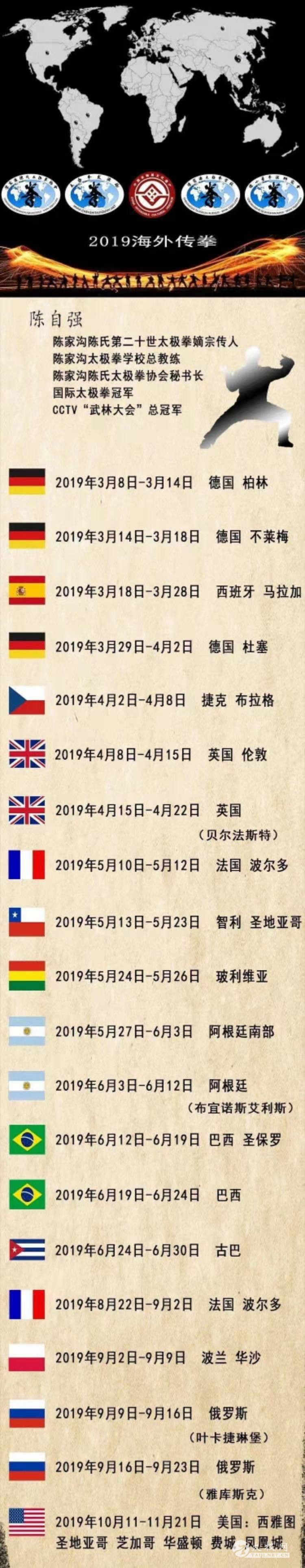 国际太极拳冠军 CCTV【武林大会】总冠军 1977年出生于“太极拳发源地”河南温县陈家沟太极拳世家,陈家沟陈氏第二十世太极拳嫡宗传人,自幼随父亲“陈家沟陈氏第十九世太极拳守门人”陈小星习练家传拳械,并得到二伯父“陈家沟陈氏第十九世太极拳掌门人”陈小旺的悉心指导,加之聪颖刻苦,勤于钻研,不仅擅长陈氏太极拳套路,以及各种器械,对太极拳推手、太极散手颇为谙熟,动作弹抖靠发、迅猛冷脆,功夫极具威力。 陈自强——武动寰宇 一、陈自强老师国外传拳视频锦集 1、国外广为流传的经典视频: 2、陈自强南美玻利维亚行拳: 3、陈自强在柏林的散推教学演示视频: