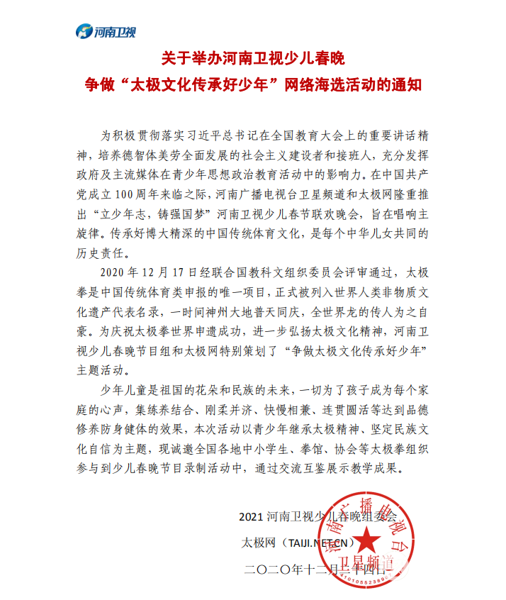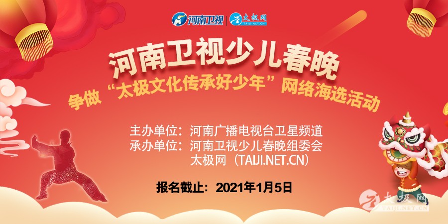 关于举办河南卫视少儿春晚 争做“太极文化传承好少年”网络海选活动的通知 为积极贯彻落实习近平总书记在全国教育大会上的重要讲话精神,培养德智体美劳全面发展的社会主义建设者和接班人,充分发挥政府及主流媒体在青少年思想政治教育活动中的影响力。在中国共产党成立100周年来临之际,河南广播电视台卫星频道和太极网隆重推出“立少年志,铸强国梦”河南卫视少儿春节联欢晚会,旨在唱响主旋律。传承好博大精深的中国传统体育文化,是每个中华儿女共同的历史责任。 2020年12月17日经联合国教科文组织委员会评审通过,太极拳是中国传统体育类申报的唯一项目,正式被列入世界人类非物质文化遗产代表名录,一时间神州大地普天同庆,全世界龙的传人为之自豪。为庆祝太极拳世界申遗成功,进一步弘扬太极文化精神,河南卫视少儿春晚节目组和太极网特别策划了“争做太极文化传承好少年”主题活动。 少年儿童是祖国的花朵和民族的未来,一切为了孩子成为每个家庭的心声,集练养结合、刚柔并济、快慢相兼、连贯圆活等达到品德修养防身健体的效果,本次活动以青少年继承太极精神、坚定民族文化自信为主题,现诚邀全国各地中小学生、拳馆、协会等太极拳组织参与到少儿春晚节目录制活动中,通过交流互鉴展示教学成果。 2021河南卫视少儿春晚组委会 太极网(TAIJI.NET.CN) 二〇二〇年十二月二十四日 活动方案 一、活动组织 主办单位:河南广播电视台卫星频道 承办单位:河南卫视少儿春晚组委会、太极网(TAIJI.NET.CN) 冠名单位:诚邀品牌信誉良好的企业单位及各团队组织参与赛事冠名及赞助,现金或实物皆可,冠名合作洽谈截至2021年1月5日。 协办单位:名师启慧河南分公司