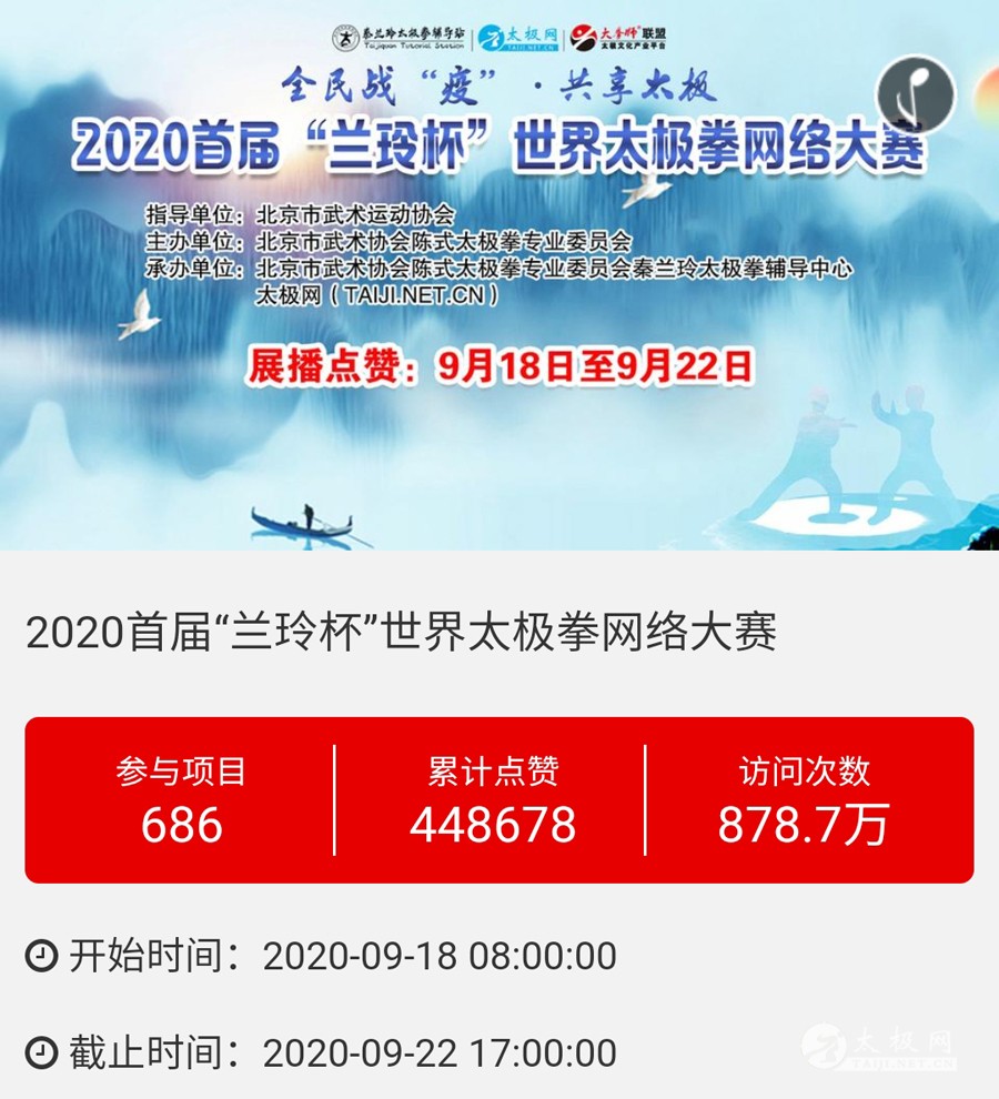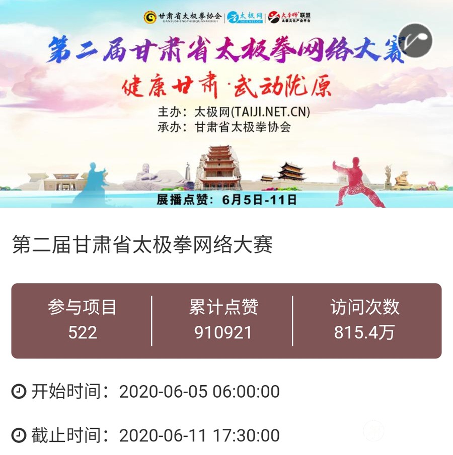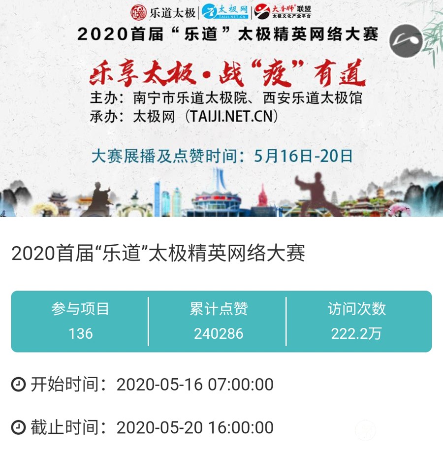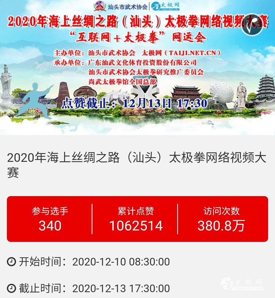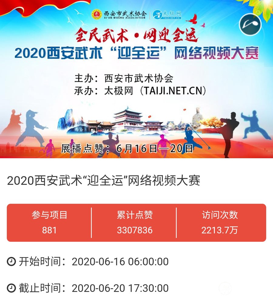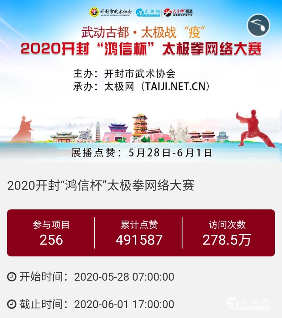 时光飞逝,2020年收官倒计时,这一年非同寻常,是中华民族历史上也是人类历史上极其不寻常的一年,战“疫”成为年度主旋律。 年初,随着全球疫情肆虐,广大太极人居家健身积极抗疫,成为战疫热潮中的亮丽风景线。面对这场全球“健康战”,享誉世界的完美健身运动太极拳发挥着不可估量的社会和科学价值,为抗击疫情贡献了巨大力量。 年末,随着联合国教科文组织正式宣布太极拳入列人类非物质文化遗产代表作名录,太极拳的价值受到世界人民更广泛的认可,太极文化受到世界人民更高的尊重,太极拳迎来发展历史的巅峰荣耀时刻。 世界,从此太极! 创立于1997年的太极网立足太极拳发源地,面向全球,领衔太极文化传播推广与产业生态圈建设20余载。2020年,太极网团队在创始人刘洪奇、总编李超的领导下齐心协力,砥砺前行。自2015年首创太极拳网络视频大赛至今,持续领航“互联网+太极拳”网络赛事活动。2020年,全年积极响应国家体育总局关于推广居家科学健身和举办武术网赛的号召,与各地体育总会、武协成功合作举办二十余起大型武术网赛,直接参赛人数达数万人,覆盖人群千万计,依托“互联网+”助力全民抗疫。 在全面做好线下赛事活动防疫工作的前提下,扬帆“太极和远方”系列武术文旅活动,通过太极网、大拳师联盟等策划组织的武术赛事活动均取得了极其耀眼的成绩和辉煌。与甘肃敦煌、焦作云台山、云南丽江等地政府、景区联手打造多起武术文旅盛会,受到各地政府和武术界高度认可与肯定。 今天太极网总编室编辑部为大家梳理分享太极网这一年来主导的武术活动,共同回顾这一年的收获与感动。在此要特别感谢广大拳友、拳师、馆校协会以及合伙伙伴的信任和支持,以下为部分活动列举,篇幅有限未能提及的一并表示诚挚感谢。 太极战“疫”——居家健身太极网络公益大赛 打响太极战“疫”网赛第一枪,引领2020年度“互联网+武术”赛事活动浪潮!为积极响应国家居家隔离抗疫、居家科学健身的号召,太极拳发源地河南温县积极行动,温县文化广电和旅游局、陈家沟景区管理局、温县太极拳武术文化管理中心、温县武术协会和太极网(TAIJI.NET.CN)联合发起举办《太极战“疫”——居家健身太极网络公益大赛》。 大赛自2月15日起策划筹备至网络展播成功上线仅半月时间,活动报名远超预期规模,10天时间报名即达千人,经过筛选通过922部参赛作品。3月6日至10日大赛全体同台展播,千万太极人同台交流互动,通过网络传播太极正能量,为抗疫加油,5天展播累计网络访问量高达2700余万次,投票点赞达191万次,全球太极人联动响应“网练太极·居家战疫”,空前盛况刷爆太极人的朋友圈。 2020首届“尊古”太极精英网络大赛 温县庆州武院、太极网(TAIJI.NET.CN)联合发起举办2020首届“尊古”太极精英网络大赛,以“尊古为先·传承有后”为主题,依托“互联网+太极拳”传播手段,创新尊古太极传播模式,既是对“尊古”太极体系发展的一次网络“阅兵”,更有力地扩大了尊古太极影响力。 大赛累计500余名选手参赛,5月1日至5日大赛全体同台网络展播,累计网络访问量655万,点赞131万。这是尊古太极体系整体宣传与推广的一次巨大突破和成功,是全体尊古太极人的成功和荣誉,“尊古太极”受到武术界空前关注,影响巨大。 2020第二届甘肃省太极拳网络视频大赛 甘肃省太极拳协会、太极网(TAIJI.NET.CN)联合发起举办2020第二届甘肃省太极拳网络视频大赛,“网练”太极为战“疫”加油。 赛事以“健康甘肃·武动陇原”为主题,千万拳友踊跃互动交流,盛况空前,好评如潮。大赛开启报名至展播受到了太极拳爱好者们的广泛关注和支持,参赛选手五百余人,共522部参赛作品进入网络展播。大赛全体同台展播点赞从6月5日开始,截至11日收官,累计网络访问量815余万次,投票点赞91余万次,广大拳友们互动留言频繁刷屏,高达百万余条,极其有力地助推了甘肃地区太极拳展示传播走向全国! 2020首届“乐道”太极精英网络大赛 太极网、南宁乐道太极院、西安乐道太极馆联合发起举办2020首届“乐道”太极精英网络大赛,弘扬太极正能量,为战“疫”加油。赛事以《乐享太极·战“疫”有道》为主题,依托“互联网+太极拳”传播手段,创新太极传播模式。 大赛参赛选手200余人,累计收到134个参赛项目。经过5月16日-20日共5天的全体同台展播,平台网络访问量累计222.2万次,点赞240286次,留言两万余条!“乐道太极”品牌传播在全国太极界引发关注和热议。 2020开封“鸿信杯”太极拳网络大赛 开封市武术协会、太极网联合发起举办2020开封“鸿信杯”开封太极拳网络大赛,弘扬太极正能量,为战“疫”加油。 大赛参赛选手400余人,经组委会审核选出248个参赛项目进行网络展播。5月28日-6月1日共5天的大赛全体同台展播,平台网络访问量累计278.5万次,点赞491587次,留言两万余条! 9月19日,大赛颁奖典礼于开封市万岁山公园大宋武侠城南广场隆重举行,来自全国各地的参赛拳友及名师名家200余人共襄盛会。 首次创新依托“互联网+”,古城开封太极人风采传播至全国各地,同时也吸引了多地拳友同台“云竞技”,彰显了开封武术的巨大魅力。 2020西安武术“迎全运”网络视频大赛 为积极贯彻落实国家十四部委《武术产业发展规划(2019-2025年)》,进一步普及和推广武术项目,激发武术产业发展