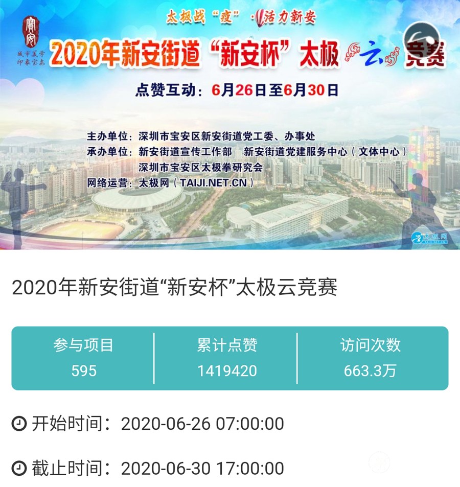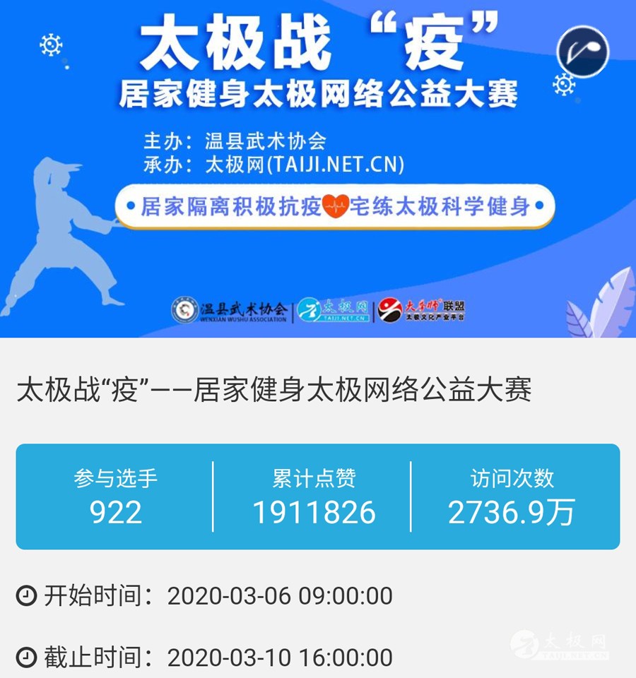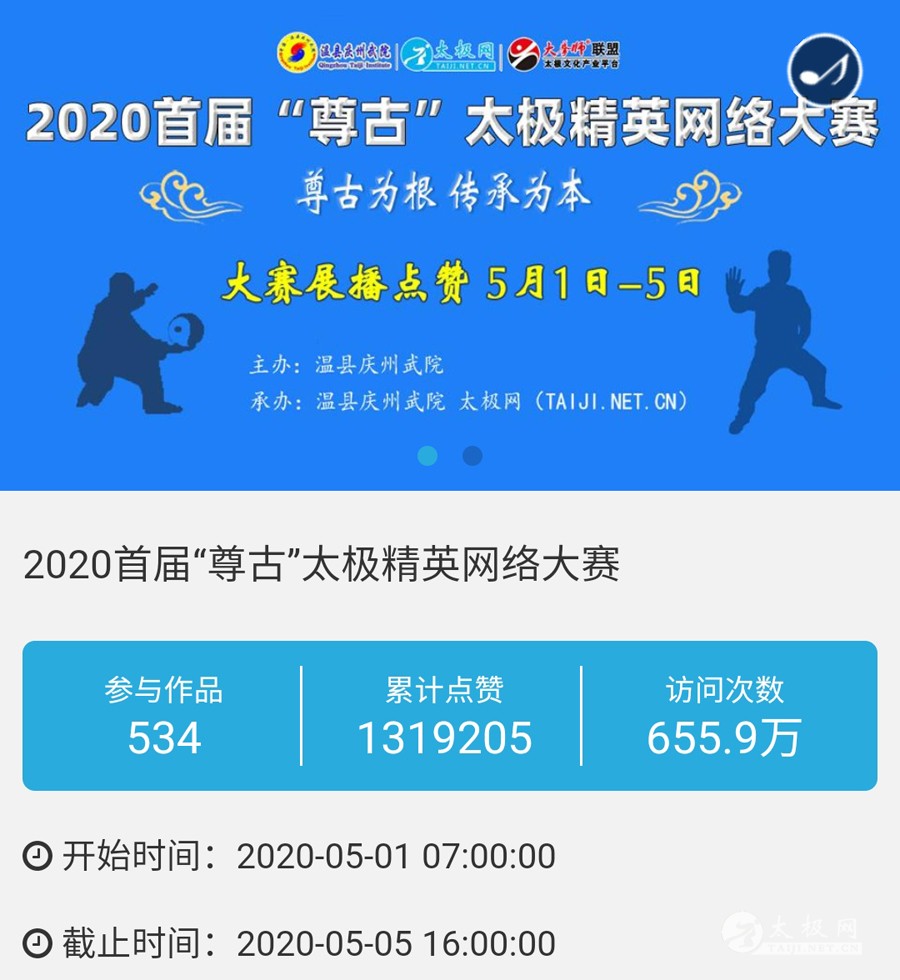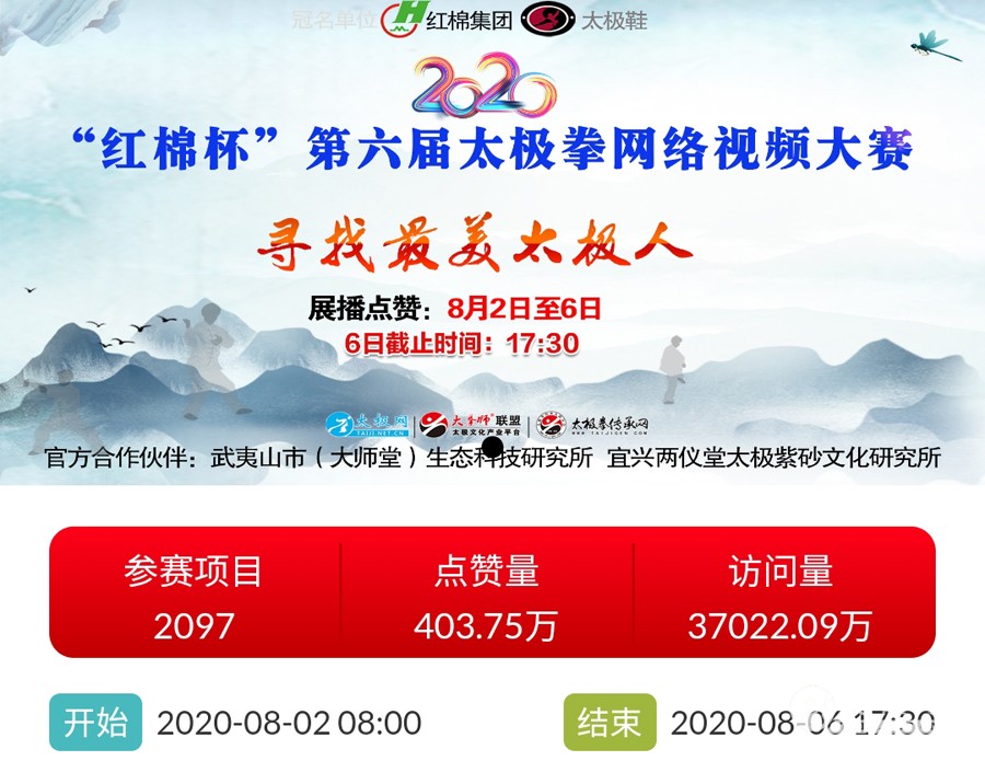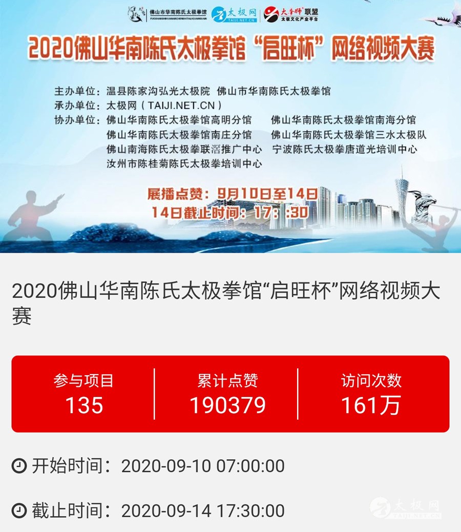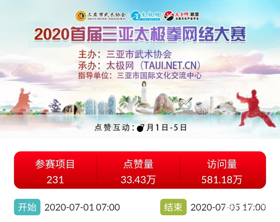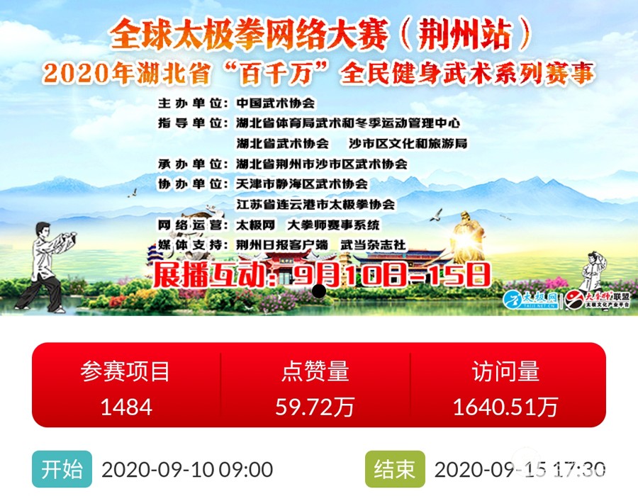 时光飞逝,2020年收官倒计时,这一年非同寻常,是中华民族历史上也是人类历史上极其不寻常的一年,战“疫”成为年度主旋律。 年初,随着全球疫情肆虐,广大太极人居家健身积极抗疫,成为战疫热潮中的亮丽风景线。面对这场全球“健康战”,享誉世界的完美健身运动太极拳发挥着不可估量的社会和科学价值,为抗击疫情贡献了巨大力量。 年末,随着联合国教科文组织正式宣布太极拳入列人类非物质文化遗产代表作名录,太极拳的价值受到世界人民更广泛的认可,太极文化受到世界人民更高的尊重,太极拳迎来发展历史的巅峰荣耀时刻。 世界,从此太极! 创立于1997年的太极网立足太极拳发源地,面向全球,领衔太极文化传播推广与产业生态圈建设20余载。2020年,太极网团队在创始人刘洪奇、总编李超的领导下齐心协力,砥砺前行。自2015年首创太极拳网络视频大赛至今,持续领航“互联网+太极拳”网络赛事活动。2020年,全年积极响应国家体育总局关于推广居家科学健身和举办武术网赛的号召,与各地体育总会、武协成功合作举办二十余起大型武术网赛,直接参赛人数达数万人,覆盖人群千万计,依托“互联网+”助力全民抗疫。 在全面做好线下赛事活动防疫工作的前提下,扬帆“太极和远方”系列武术文旅活动,通过太极网、大拳师联盟等策划组织的武术赛事活动均取得了极其耀眼的成绩和辉煌。与甘肃敦煌、焦作云台山、云南丽江等地政府、景区联手打造多起武术文旅盛会,受到各地政府和武术界高度认可与肯定。 今天太极网总编室编辑部为大家梳理分享太极网这一年来主导的武术活动,共同回顾这一年的收获与感动。在此要特别感谢广大拳友、拳师、馆校协会以及合伙伙伴的信任和支持,以下为部分活动列举,篇幅有限未能提及的一并表示诚挚感谢。 太极战“疫”——居家健身太极网络公益大赛 打响太极战“疫”网赛第一枪,引领2020年度“互联网+武术”赛事活动浪潮!为积极响应国家居家隔离抗疫、居家科学健身的号召,太极拳发源地河南温县积极行动,温县文化广电和旅游局、陈家沟景区管理局、温县太极拳武术文化管理中心、温县武术协会和太极网(TAIJI.NET.CN)联合发起举办《太极战“疫”——居家健身太极网络公益大赛》。 大赛自2月15日起策划筹备至网络展播成功上线仅半月时间,活动报名远超预期规模,10天时间报名即达千人,经过筛选通过922部参赛作品。3月6日至10日大赛全体同台展播,千万太极人同台交流互动,通过网络传播太极正能量,为抗疫加油,5天展播累计网络访问量高达2700余万次,投票点赞达191万次,全球太极人联动响应“网练太极·居家战疫”,空前盛况刷爆太极人的朋友圈。 2020首届“尊古”太极精英网络大赛 温县庆州武院、太极网(TAIJI.NET.CN)联合发起举办2020首届“尊古”太极精英网络大赛,以“尊古为先·传承有后”为主题,依托“互联网+太极拳”传播手段,创新尊古太极传播模式,既是对“尊古”太极体系发展的一次网络“阅兵”,更有力地扩大了尊古太极影响力。 大赛累计500余名选手参赛,5月1日至5日大赛全体同台网络展播,累计网络访问量655万,点赞131万。这是尊古太极体系整体宣传与推广的一次巨大突破和成功,是全体尊古太极人的成功和荣誉,“尊古太极”受到武术界空前关注,影响巨大。 2020第二届甘肃省太极拳网络视频大赛 甘肃省太极拳协会、太极网(TAIJI.NET.CN)联合发起举办2020第二届甘肃省太极拳网络视频大赛,“网练”太极为战“疫”加油。 赛事以“健康甘肃·武动陇原”为主题,千万拳友踊跃互动交流,盛况空前,好评如潮。大赛开启报名至展播受到了太极拳爱好者们的广泛关注和支持,参赛选手五百余人,共522部参赛作品进入网络展播。大赛全体同台展播点赞从6月5日开始,截至11日收官,累计网络访问量815余万次,投票点赞91余万次,广大拳友们互动留言频繁刷屏,高达百万余条,极其有力地助推了甘肃地区太极拳展示传播走向全国! 2020首届“乐道”太极精英网络大赛 太极网、南宁乐道太极院、西安乐道太极馆联合发起举办2020首届“乐道”太极精英网络大赛,弘扬太极正能量,为战“疫”加油。赛事以《乐享太极·战“疫”有道》为主题,依托“互联网+太极拳”传播手段,创新太极传播模式。 大赛参赛选手200余人,累计收到134个参赛项目。经过5月16日-20日共5天的全体同台展播,平台网络访问量累计222.2万次,点赞240286次,留言两万余条!“乐道太极”品牌传播在全国太极界引发关注和热议。 2020开封“鸿信杯”太极拳网络大赛 开封市武术协会、太极网联合发起举办2020开封“鸿信杯”开封太极拳网络大赛,弘扬太极正能量,为战“疫”加油。 大赛参赛选手400余人,经组委会审核选出248个参赛项目进行网络展播。5月28日-6月1日共5天的大赛全体同台展播,平台网络访问量累计278.5万次,点赞491587次,留言两万余条! 9月19日,大赛颁奖典礼于开封市万岁山公园大宋武侠城南广场隆重举行,来自全国各地的参赛拳友及名师名家200余人共襄盛会。 首次创新依托“互联网+”,古城开封太极人风采传播至全国各地,同时也吸引了多地拳友同台“云竞技”,彰显了开封武术的巨大魅力。 2020西安武术“迎全运”网络视频大赛 为积极贯彻落实国家十四部委《武术产业发展规划(2019-2025年)》,进一步普及和推广武术项目,激发武术产业发展