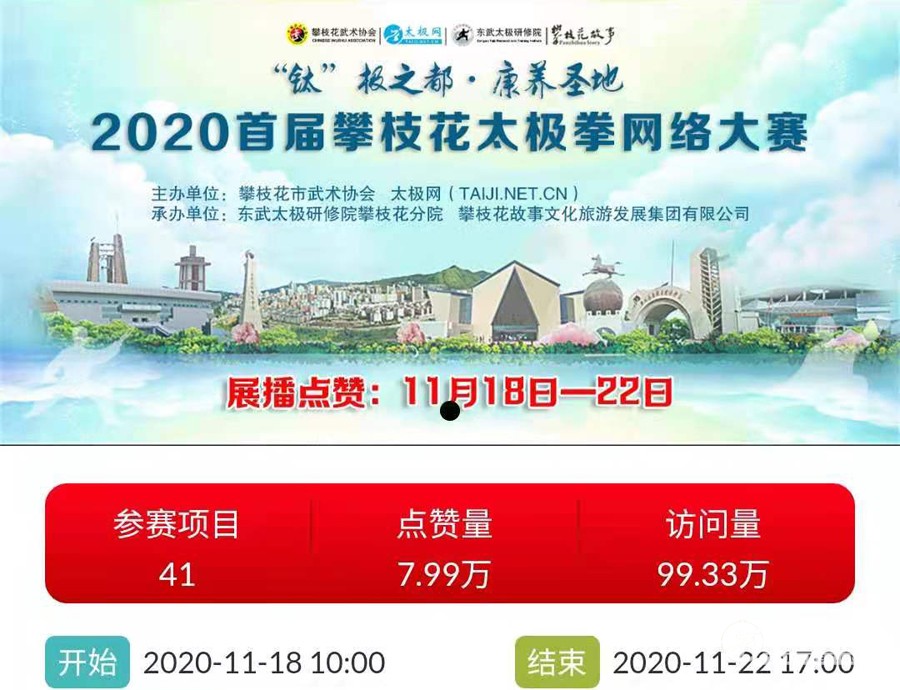 首届攀枝花“互联网+太极拳”网运会 攀枝花市武术协会、太极网(TAIJI.NET.CN)、东武太极研修院攀枝花分院、攀枝花故事文化旅游发展集团有限公司等联合发起举办2020首届攀枝花太极拳网络大赛,弘扬太极正能量,为战“疫”加油。11月22日下午,2020首届攀枝花太极拳网络大赛经过5天持续高能燃烧圆满收官。大赛视频展播点赞环节从11月18日开始,截至22日收官,平台累计网络访问量100万次,投票点赞7.9万次。 本次活动是攀枝花市太极拳发展的创新展示,组委会的精心筹备工作,受到了当地政府的高度认可与肯定。为攀枝花太极拳和攀枝花武术都注入了优质的“互联网”元素,奠定和夯实了当地武术网络传播的沃土。