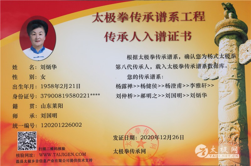 心系太极 无悔人生 她奔走于动静世界,出入无极而生,动静之机,秉持坚韧不拔,艰苦卓绝,动之则分,静之则合,给人以前进的鼓舞与力量。 她是这个世界上难得耐寂寞于繁华,持淡然于浮世之人,和她在一起,你会在如此浮躁世间,感受到难得的宁静。 她是一个爱学习和深钻细研之人,学海无涯、永无止境是她的真实写照,和她在一起学拳、练剑你会感受到学习与进步的快乐。 她崇尚中庸之道,无过不及,随曲就伸,温雅得体,宽容大方,凸显真诚 、善良、 热心 ,和她在一起没有交流的压力,没有信任的疑虑。 她的一副单车骑遍了城市乡村,成了一道风景;她的独特挽髻发型是这个世界上还余存着令人惊艳称赞的古典美;她有着典型北方人的聪慧、非凡气韵与美丽,由内而外散发,是太极让她享用一生风趣浪漫的丰富生活。 她,就是年已66岁,习练太极拳20余载,曾获地、市级太极拳、剑、棍等多项第一名,2020年第六届寻找最美太极人红棉杯网络大赛“最美太极人”获得者一一刘炳华。 (一)邂逅太极 立志终身 家住山东烟台莱阳的刘炳华,从小就爱好体育,尤其对田径运动项目有着浓厚的兴趣,是学校的体育骨干各项田径运动成绩非常优异。而对于太极拳,则是因一场邂逅而结下的太极缘。刘炳华告诉我,当初结识太极拳纯属偶然。20年前,一次无意间看到一位老者悠闲的打拳,一招一式,绕来绕去,舒展大方,柔中带刚,让人赏心悦目,后来才知道这是中国传统武术一一太极拳。至此,她就喜欢上了这项具有传统文化并富有哲理的太极拳,或许是一种缘份所至,她毫不犹豫地做出了“终身与太极相伴"的约定。 刘炳华对太极喜爱的程度远不是一般人所能理解的。为了这个约定,她几乎把大量时间都用在寻师访友、学拳练拳上了。采访中,刘炳华说:“我对太极拳很执着,也很着迷,几乎到了着魔的地步,这一切也多亏了老伴及孩子们的全力支持,成全了我的太极梦。”其实,她的老伴张明德也是太极拳爱好者,为了支持她练拳,自己承担了全部家务,为的是让她有更多时间做推广太极拳、传承太极文化的事。“去年,有段时间因脚受伤不能骑自行车时,老伴就当起专职司机,车接车送去看太极队学员们练拳,从没发牢骚,从无怨言,我有今天的成绩,他功不可没。”刘炳华如是说。 就这样,她全身心地一头扎进了太极拳的修习中,这一练就是二十年。二十年的太极生活也让刘炳华创造了太极圈中一个又一个神话,她成了莱阳乃至烟台、青岛太极拳、剑、棍等多项比赛的第一名,成了家喻户晓的太极拳老师,也成了全国“最美太极人”和“中华太极拳传承人”。 现在想来,这似乎是她与太极注定一辈子的缘分,那种浅淡中的相守,没有张扬的幸福,亦没有幸福的张扬,只有淡淡的相守。就像与太极的相遇,没有抑扬,亦没有顿挫。故事平淡得犹如一眼清泉,轻轻地、静静地流淌在岁月的长河里。看似不起波澜,偶有涟漪,但经过二十年春夏秋冬的交替,风霜雪雨的磨砺,寒冬酷暑的摔打,也成就了刘炳华与众不同的太极人生。 (二)坚持不懈 终会有成 “学会一套拳并不难,但练好一套拳,并不容易,非得下苦功夫不可。要坚持不懈的磨练、修正,才能够精益求精。而随着坚持的深入,练拳的好处才会一点一滴回馈给我们的身体和内心。"这是刘炳华二十年习练太极的内心感悟。 刘炳华认为,世界上有两个词,一个叫用心,一个叫执着。用心的人改变自己,执着的人改变命运,只要坚持在路上,就没有到不了的远方。练拳也是一样,它不在多而在精,而在于是否用心练拳?是否有执着的精神去练拳?是否每天留一趟拳的时间?要知道,每打一遍就要有一遍的体会,每练一天就要有一天的收获。它不是简单的重复,不管从哪个方面讲,功夫就是一点点积累的。 她是这样说的,也是这样做的。2011年刘炳华脚严重受伤,医生断定若恢复不好将无缘再练拳了。因为伤情她五年没去公园练拳,也不敢去看别人练拳,生怕自己动心控制不住。五年的伤痛折磨,没有磨灭她心中的太极梦想。反而,为了喜爱的太极,她不信这个邪,硬是与伤病较上了劲,一边养伤,一边坚持练功。待伤势逐渐好转后,她继续给自己加压,增大了训练量,每天坚持训练5个小时,风雨无阻,晴天就到室外练,阴雨天就在自家二楼练,就这样凭着顽强的毅力,经过自己的逆天训练,终于又能打拳练剑了。 2018年3月27号骑自行车去公园练拳,回家路上因下大坡时自行车车把、链条断裂而摔倒,脚又一次受重伤,脚肿的穿不下鞋,但她还是咬着牙,吃着止痛消炎药,于29日去莱州把教练证书考了回来。 用她自己的话说,当时就是着魔了,只要生活中有太极拳,心里就踏实,一天不练拳就浑身不自在,总觉得少点什么,食不甘甜,寝不安席,坐立难安。“要练好太极拳就得有一种精神,贵在坚持、贵在常练、贵在自觉、贵在持久、贵在常思、贵在体悟、贵在不断提升自己。”这也是刘炳华经常与学员们说的最多的一句话。言语中透着坚强与执着,确实让人打心眼里敬佩。 (三)拜师学艺 义务授拳 回顾二十年自己的学拳经历,刘炳华非常感恩三位太极师父。 2000年,由于身体状况欠佳,经人介绍认识了启蒙师父张承宗和张燕,经过师父的精心传授和反复指导,她的身体慢慢好转起来,从此便爱上了太极拳,开始了走上了习拳之路,这是她在太极路上迈出的第一步,由一般了解转变成了兴趣爱好。 2017年,一场