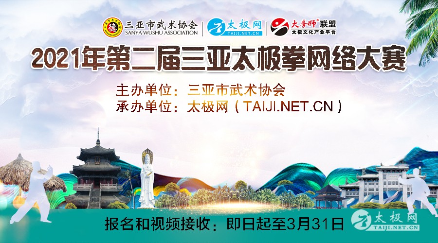 2020年,是中华民族历史上也是人类历史上极其不寻常的一年,战“疫”成为年度主旋律。年末,太极拳正式入列人类非物质文化遗产代表作名录,太极文化受到世界人民更高的尊重,太极拳迎来发展历史的巅峰荣耀时刻。 2021年,牛年开启,太极拳将迎来更大的发展,继2020年首届大赛成功举办,由三亚市武术协会、太极网(TAIJI.NET.CN)再次联合发起举办2021年第二届三亚太极拳网络大赛,共同迎接"世界从此太极"这一浪潮! 赛事以《健康三亚·世界太极》为主题,依托“互联网+太极拳”传播手段,创新武术传播模式。赛事由报名、录制参赛视频、在线展播及投票、专家评审、颁奖典礼等环节组成。 春风花草香,太极养健康!人类非遗太极拳春风已至,诚邀全球太极人同沐共享。 2021年第二届三亚太极拳网络大赛 竞赛规程 一、活动组织 主办单位:三亚市武术协会 承办单位:太极网(TAIJI.NET.CN) 指导单位:三亚市旅游和文化广电体育局 协办单位: 陕西省西安萃华武术馆咸阳分馆 山亭区武术运动协会 孟州市老年体育协会 深圳市厚德书院 咸阳古渡太极梦代表队 北京市海淀区紫竹院代表队 海南三亚市吉阳区荔枝沟南新太极辅导站 北京海淀区学院路建清园太极队 广东省梅州市太极拳协会 三亚市武术协会崖州湾科技城太极拳辅导站 北京市武术协会甘家口地区太极拳协会 三亚市武术协会秦兰玲太极拳辅导中心 范鸿信太极拳学会东莞分会 北京市武术运动协会陈式太极拳专业委员会秦兰玲太极拳辅导中心 黑龙江省柴河地区武术协会 北京市武术运动协会陈式太极拳专业委员会牡丹江春天太极拳辅导站 河南省焦作市和式太极拳协会 国防大学太极拳健身气功队 北京武术运动协会甘家口太极拳协会航天站 北京市武术运动协会甘家口太极拳协会大兴站 北京昌平陈小旺太极拳(推广中心)温泉站 二、活动时间 1. 报名和视频接收:即日起至3月31日。 2. 大赛全体同台展播及网络投票:4月3日-7日。 3. 专家评审及成绩公布:5月份。 三、参赛对象 各流派太极拳组织及个人爱好者。 四、竞赛项目 (一)个人项目 1. 传统项目 拳术类:陈式太极拳、杨式太极拳、吴式太极拳、孙式太极拳、武式太极拳、和式太极拳、八段锦、健身气功、其他太极拳。 器械类:陈式太极拳器械、杨式太极拳器械、吴式太极拳器械、孙式太极拳器械、武式太极拳器械、和式太极拳器械、其他流派器械。 2. 规定项目 陈式太极拳、杨式太极拳、吴式太极拳、武式太极拳、孙式太极拳的竞赛套路;24式太极拳、42式太极拳、32式太极剑、42式太极剑。 (二)集体项目 拳术类、器械类、拳械混编。