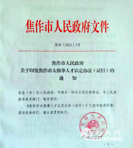 焦作市人民政府 焦政〔2021〕3号 焦作市人民政府 关于印发焦作市太极拳人才认定办法(试行)的通知 各县(市)区人民政府,市城乡一体化示范区管委会,市人民政府各有关部门,有关单位: 《焦作市太极拳人才认定办法(试行)》已经市政府同意,现印发给你们,请认真贯彻执行。 2021年3月3日 焦作市太极拳人才认定办法(试行) 第一章 总 则 第一条 为深入贯彻黄河流域生态保护和高质量发展国家战略部署,落实“两山两拳”重大布局,促进太极拳人类非物质文化遗产在发展中得到充分保护,弘扬太极拳文化,涵养太极拳人才队伍,助力“世界太极城·中原养生地”建设,根据武术段位制管理有关规定、非物质文化遗产传承人标准要求、焦作市人才评价体系改革发展政策,结合太极拳传统武术文化发展的实际需要,制定本办法。 第二条 本办法所称太极拳人才,是指为焦作市太极拳事业发展做出贡献,达到国家武术段位(太极拳项目)相应水平或符合非物质文化遗产传承人相应标准的人员。 第三条 太极拳人才认定工作坚持公开、公正、公平的原则,坚持品德、知识、能力和业绩并重的原则,坚持业内认可、社会公认的原则。 第四条 市人力资源和社会保障局、体育局、文化广电和旅游局指导、监督市太极拳协会建立太极拳行业专家库,每次评审认定时从专家库中抽取专家成立太极拳行业专家委员会,具体负责太极拳人才认定、考核等工作。 第五条 市太极拳人才认定设为四级:特级太极拳师、高级太极拳师、中级太极拳师、初级太极拳师。 第二章 认定条件和标准 第六条 申请人须具备下列基本条件: (一)拥护中国共产党的领导,热爱社会主义祖国,自觉践行社会主义核心价值观; (二)诚实正派、谦和善良、遵纪守法、好义担当; (三)有良好的职业操守、严谨的作风和科学、求实、团结、协作的精神; (四)热爱太极拳运动,致力于太极拳习练、研究和推广; (五)积极参与公益性太极拳推广活动,推进太极拳的传承和弘扬,努力为繁荣发展太极拳事业服务。 第七条 申请人除符合第六条规定外,同时分级具备以下相应条件: (一)特级太极拳师:创新发展太极拳实践与理论,在传承弘扬太极拳事业中发挥重要作用;获得国家级非物质文化遗产太极拳项目传承人称号或达到中国武术高级段位级别等相应水平;有太极拳专著出版或作为主要成员参与国家级武术课题、教材编撰;曾培养过国家级、国际级赛事冠、亚、季军;培养普及太极拳人数达万人以上;在太极拳界具有较高社会名望。 (二)高级太极拳师:在国内外传授太极拳具有较大影响,有深厚的太极拳理论功底;获得省、市级非物质文化遗产太极拳项目传承人称号或达到中国武术高级段位级别等相应水平;有太极拳专著出版或参与省级以上武术课题、教材编撰;曾荣获国家级、国际级赛事冠、亚军或曾培养过省级以上赛事冠、亚、季军;培养普及太极拳人数达千人以上;对焦作市太极拳事业发展做出突出贡献。 (三)中级太极拳师:常年开展太极拳推广普及工作,理论成果较多;获得县级非物质文化遗产太极拳项目传承人称号或达到中国武术六段级别(获得国家级社会体育指导员〔太极拳项目〕称号)等相应水平;为焦作市太极拳事业发展做出较大贡献。 (四)初级太极拳师:积极参与社区(行政村)、单位太极拳推广普及工作;获得中国武术四、五段级别或获得国家一级社会体育指导员(太极拳项目)称号等相应水平;产生积极社会效果和影响。 第三章 认定程序 第八条 市太极拳人才按以下程序认定: (一)个人申请。申请人向所在县(市)区体育主管部门或武术(太极拳)协会提出认定申请,填写《焦作市太极拳人才认定申请表》,并提供相关证明材料。 (二)认定评审。县(市)区体育局、人力资源和社会保障局、文化广电和旅游局将申报材料汇总审核后,报市太极拳协会;市太极拳协会会同市人力资源和社会保障局、体育局、文化广电和旅游局,从太极拳行业专家库中随机抽取专家组成太极拳行业专家委员会,依据本《办法》认定标准,对申请人的综合能力进行考核评审认定,确定其相应级别。 (三)联审公示。对认定相应级别的申请人,由市人力资源和社会保障局、体育局、文化广电和旅游局联合审查,对符合认定条件的人选,分别在市人力资源和社会保障局、体育局、文化广电和旅游局网站以及焦作市全民健身公众微信平台进行公示,公示期为5个工作日。 (四)颁发证书。经公示无异议或异议不成立的人选,由市太极拳协会颁发证书;市人力资源和社会保障局将其纳入全市人才库。 第四章 激 励 第九条 对经过考核评审并授予“特级太极拳师”称号的太极拳人才,颁发牌匾。 第十条 对特级太极拳师、高级太极拳师按规定给予奖励,并授予焦作市高层次“人才绿卡”,享受优惠政策和配套服务。 第十一条 在社会授拳的太极拳师,可以将取得的太极拳师资格作为劳务报酬的参照依据。在社区(行政村)太极拳辅导站点授拳的太极拳师,符合政策的可享受公益性岗位待遇,也可由社区(行政村)根据工作成效给予一定补助。 第十二条 各级各部门应加大对太极拳人才工作的支持力度,提供必要的政策、资金支持,推动太极拳人才认定工作健康发展;市财政每年预算50万元,专项用于太极拳人才认定工作,以及按规定奖励特级太极拳师、高级太极拳师和为焦作市太