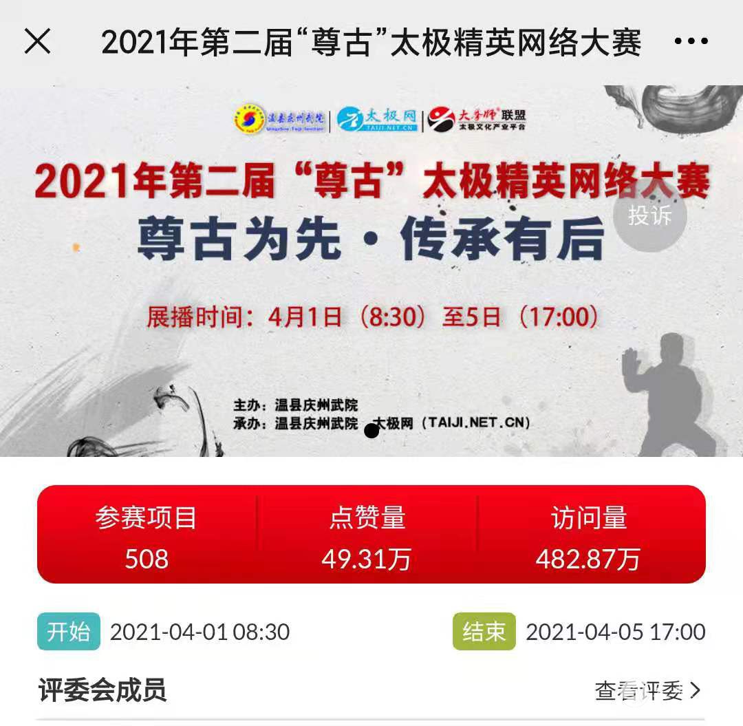 尊传统,沐古风,太极功夫,重在传承。为弘扬太极文化,传承太极精髓,增强“尊古”太极拳爱好者的向心力、凝聚力,促进交流切磋、探讨研究,传播尊古太极正能量。伴随着太极拳成为人类非物质文化遗产的春风,继2020年首届大赛成功举办,由温县庆州武院、太极网(TAIJI.NET.CN)再次联合发起举办2021年第二届“尊古”太极精英网络大赛,共同开启牛年太极网赛新征程。 大赛全体同台网络展播点赞环节从4月1日开始,截至5日17:00收官,平台累计网络访问量480余万次,投票点赞49余万次,广大拳友们互动留言频繁刷屏,连续5天燃爆太极人的朋友圈! 赛事依托“互联网+太极拳”传播手段,创新武术传播模式,由选手线上报名、线下录制参赛视频、在线展播及点赞、专家评审、颁奖典礼等环节组成。本次大赛报名经组委会严格审核通过,精选508部参赛作品进入展播环节,千万拳友踊跃互动交流,盛况空前,好评如潮。 弘扬中华武术,传播太极正能量。赛事从筹备到运营,紧张有序,得到了当地武术界以及各地武术同仁们的大力支持,充分展示了尊古太极体系以及广大太极人的风采。 本次大赛展播结束之后,技术评审工作即将开始,评审结束后统一公示成绩,届时大赛组委会还将发布颁奖典礼等线下主题活动通知,期待朋友们以网会友、以武会友,交流、交心、交朋友。 大赛组委会 责编:太极网李宁 |