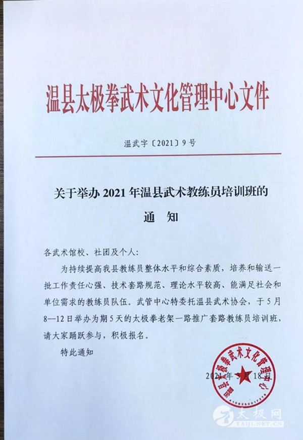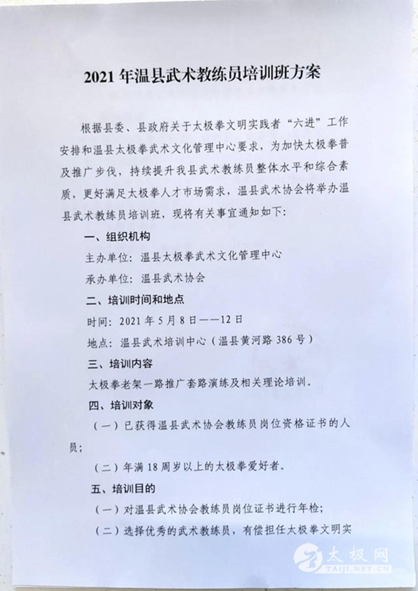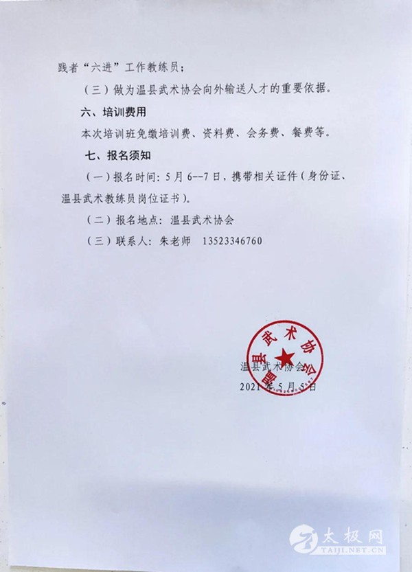 2021年温县武术教练员培训班方案 根据县委、县政府关于太极拳文明实践者“六进”工作安排和温县太极拳武术文化管理中心要求,为加快太极拳普及推广步伐,持续提升我县武术教练员整体水平和综合素质,更好满足太极拳人才市场需求,温县武术协会将举办温县武术教练员培训班,现将有关事宜通知如下: 一、组织机构 主办单位:温县太极拳武术文化管理中心 承办单位:温县武术协会 二、培训时间和地点 时间:2021年5月8日——12日 地点:温县武术培训中心(温县黄河路386号) 三、培训内容 太极拳老架一路推广套路演练及相关理论培训。 四、培训对象 (一)已获得温县武术协会教练员岗位资格证书的人员; (二)年满18周岁以上的太极拳爱好者。 五、培训目的 (一)对温县武术协会教练员岗位证书进行年检; (二)选择优秀的武术教练员,有偿担任太极拳文明实践者“六进”工作教练员; (三)做为温县武术协会向外输送人才的重要依据。 六、培训费用 本次培训班免缴培训费、资料费、会务费、餐费等。 七、报名须知 (一)报名时间:5月6--7日,携带相关证件(身份证、温县武术教练员岗位证书)。 (二)报名地点:温县武术协会 (三)联系人:朱老师 13523346760 温县武术协会 2021年5月5日 |