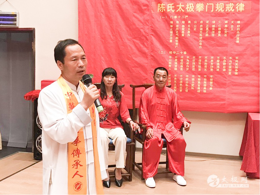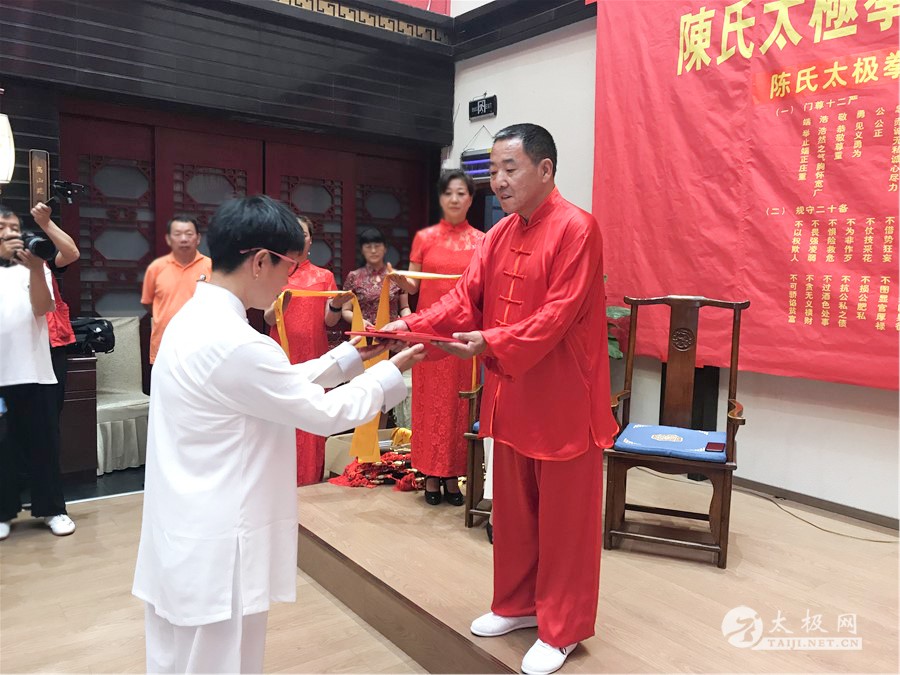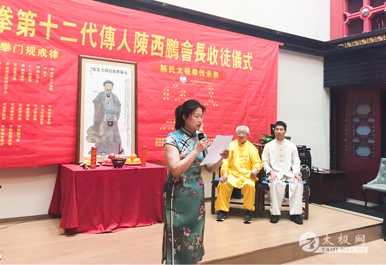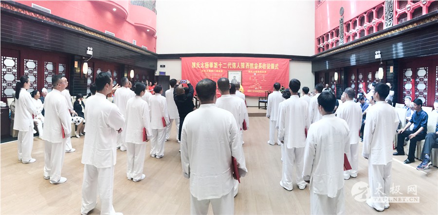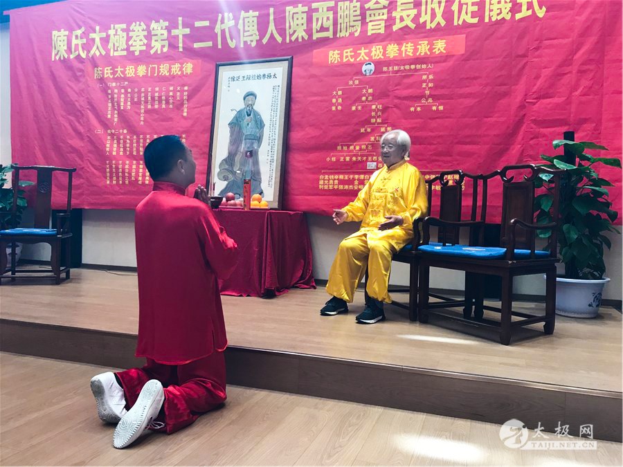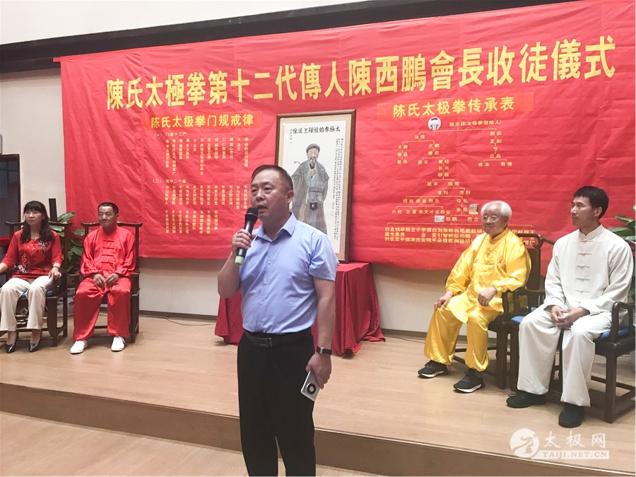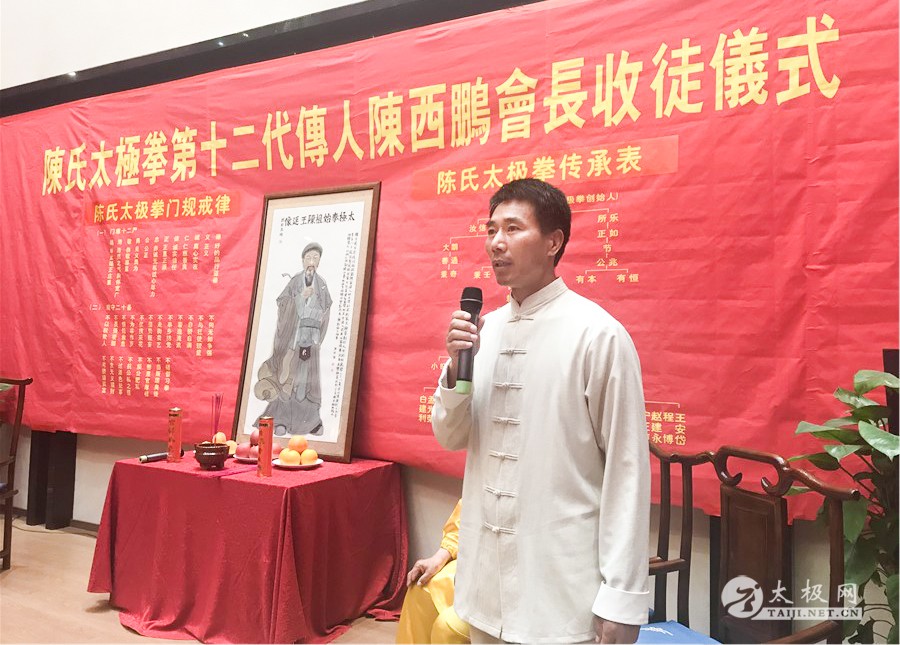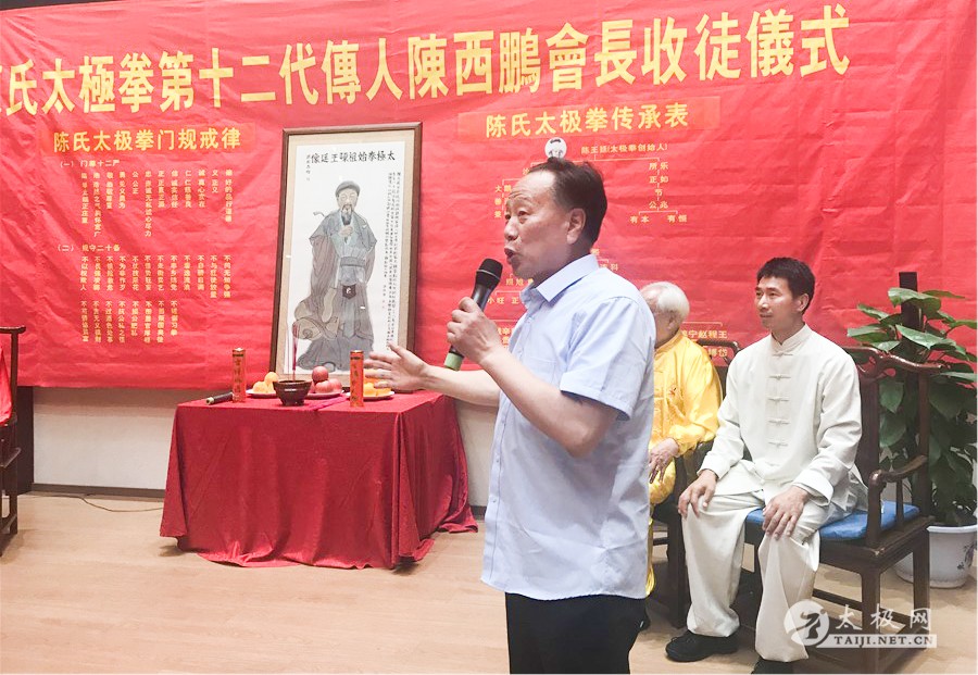 97岁高龄的陈全忠大师老当益壮,致辞时豪迈依旧,希望儿子陈西鹏带领弟子们勤学苦练、用心传承,愿新弟子们尽快成长为优秀传承人,为太极拳的传播和推广做出应有的贡献。 陈全忠致辞 宋斌致辞 方秀敏致辞 陈炳致辞 刘洪奇致辞 宣读贺信 拜师仪式遵循传统,简洁庄重。陈西鹏向太极拳始祖陈王廷像敬香行礼,以告太极拳薪火传承。新入门弟子依次上前向师父陈西鹏行拜师礼、递拜师贴、敬茶。陈西鹏向新入门弟子回帖、披挂传承人绶带。随后陈西鹏率领新入门弟子向陈全忠大师叩拜行礼。 于杰发言 新入门弟子代表于杰发言,他表示今日有幸得拜良师,今后定当谨遵师训,恪守门规,勤勉参悟,刻苦研练,为太极拳的发展和传承、为健康中国贡献自己的一份力量。在众多嘉宾们见证下,收徒仪式圆满礼成。 陈西鹏祭拜太极拳始祖陈王廷 活动现场 陈西鹏老师向全体来宾表示感谢,寄望新弟子携手团结,练好拳、做好人,传承和传播好人类非遗太极拳。陈西鹏自幼随父陈全忠习练家传陈氏太极拳,是陈氏太极拳杰出传承人之一。曾受教于族叔、太极拳大师陈小旺及陈正雷等。在家族几位大师的言传身教下,通过数十载的潜心钻研,深得陈氏太极拳拳理拳法之真谛,功力深厚纯正,精通陈氏太极拳传统套路及各种器械,尤擅拿、打、摔等诸多技法的实际运用。陈西鹏17岁便开始授拳,除西安地区外,在陕西、甘肃、河北等多地设点授拳,直接传授弟子500余人。并受邀赴法国、西班牙等海外传拳,影响卓著,为太极拳国际化传播做出了积极贡献。现长期驻扎西安传播太极,任西安陈氏太极拳研究会会长。 责编:李晓 |