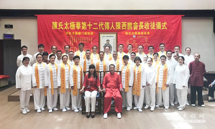 (太极网讯)古都西安在太极拳界有着“小陈沟”之美誉,众多陈家沟太极拳传人扎根此地传承推广太极拳,是当地极具生机的太极景观。2021年6月5日,陈家沟陈氏第二十世、陈氏太极拳第十二代传承人、西安陈氏太极拳研究会会长陈西鹏老师收徒传承仪式隆重举行,白建利、孟光荣、钱勇军、辛贵平、熊强、王涛、于杰、李金安、谭峻、白爱平、刘引朵、张智录、郑鲜歌、何继洲、毛柏杨、戴娟娟、赵锐、胡随平、朱保华、张江飞、申敏杰、张宇、魏敏、宁正南、赵建永、程博、王安岱等27名太极拳爱好者通过师门考核如愿拜师,正式成为陈氏太极拳传承人,肩负起传承弘扬太极文化的使命担当。师徒合影 原陕西省武术管理中心书记宋斌、西安市武术协会常务副主席方秀敏、副主席杨克俭莅临活动现场, 陈家沟国际太极院院长陈炳、太极网创始人刘洪奇应邀专程从太极拳发源地河南温县前往见证,太极拳大师陈全忠、西安陈金鳌太极拳学会名誉会长李树发等嘉宾出席活动。宋斌、方秀敏、陈炳、刘洪奇等受邀上台致辞,众嘉宾纷纷向陈西鹏老师及新弟子表示祝贺。