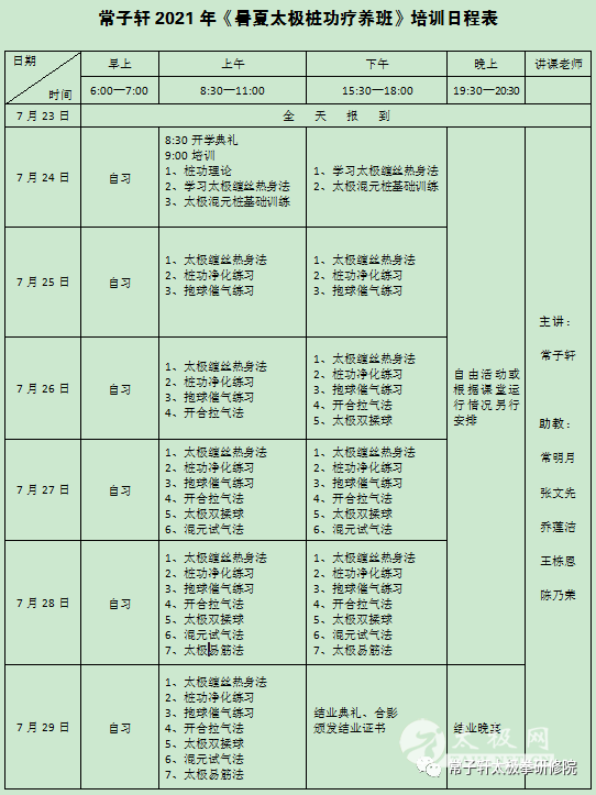 暑夏,气候炎热,阳气极盛,生机盎然,万物蒸腾,正是新陈代谢最快之时。古有“冬练三九,夏练三伏”之说,因此借助【暑夏】这大好时机,通过太极内功桩法的科学训练,补充阳气,祛寒除湿,平衡阴阳,可达事半功倍的效果。 《太极桩功疗养班》之神奇,是以调形、调气、调息之法,学员3天就能体会到极强的气感,内气充盈,遍布全身;促进气血流通、督脉畅通,免疫能力增强。通过该班【五六天】的强化训练,内气直冲病灶,特别是多年亚健康人群,身体上的疑难病症百分之八十以上有明显的改善。人人各有一丹炉,自家有气自家修。提高自身的免疫能力,激发自身的自愈功能。我的命运我做主,把握自己的命运,让生命线延长。 常子轩老师《暑夏太极桩功疗养班》开班在即,具体事宜如下: 一、培训时间: