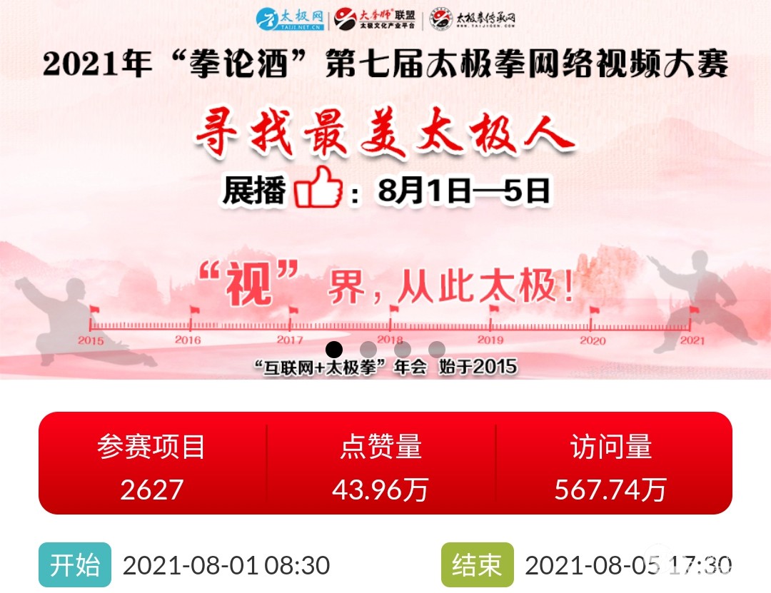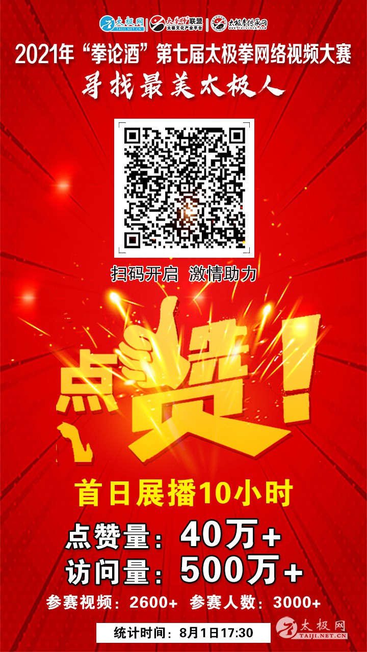 人类非物质文化遗产太极拳因其良好的健身与养生功效获得广泛的国际传播,作为中华优秀传统文化的杰出载体已获得世界的高度认可与尊重。2021年伴随着人类非遗的春风,创立于1997年的太极网旗下品牌赛事“寻找最美太极人——太极拳网络视频大赛”再度扬帆起航,携手广大太极人共同开启最美太极“视”界。 前身起源于2005年的“焦作山水杯”国际太极拳DV大赛,太极网于2015年首创“寻找最美太极人——国际太极拳网络视频大赛”,至今已连续成功举办六届,成为“互联网+太极拳”年度标志性盛会,被拳界誉为永不落幕的太极拳大赛。 8月1日8时30分,寻找最美太极人——2021年“拳论酒”第七届太极拳网络视频大赛网络展播及点赞通道正式开启,本届大赛以《“视”界太极·寻找最美》为主题,大赛规模再创新高,各地拳友和太极拳组织共3000余人参赛,精选2600余部参赛作品(含200余个集体项目),大赛虽已历经六届且备战多日,大赛展播点赞通道一经开启便盛况空前,拳友们的高涨热情依旧让人震撼,截至发稿展播不足十小时,平台访问量即飞速达到500万,点赞40余万次。面对热情澎湃的网络浪潮,组委会严阵以待,不断加强平台网络监控和维护,保障展播流畅运转。 本次网赛由在线报名、录制参赛视频、在线展播及投票、专家评审、颁奖典礼等环节组成。展播点赞时间为8月1日至5日,之后组委会还将成立专业的大赛裁判团,为全部参赛作品展开专家评审。大赛成绩评比由网络人气分(10分)、技术分(100分)、影像分10分组成。在此,组委会寄望各位参赛选手开心参赛、享受大赛,同时预祝大家取得理想成绩,在赛事中交流学习、有所收获。 太极网(TAIJI.NET.CN) 太极拳网络视频大赛组委会 |