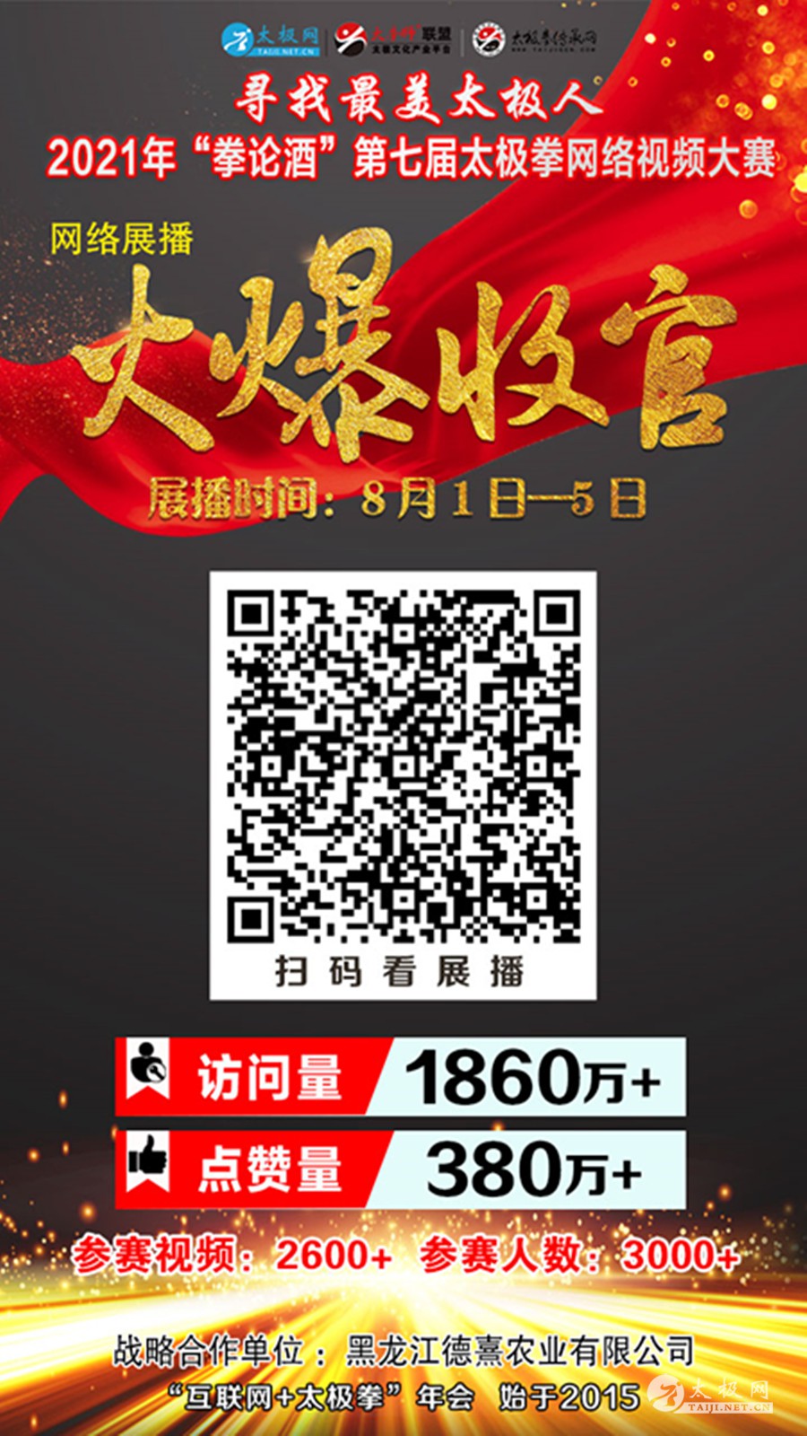 健康中国,太极同行!太极,以网会友!寻找最美、展示最美、传播最美、点赞最美!8月5日下午,一年一度的“互联网+太极拳”年度盛会、万众瞩目的2021寻找最美太极人——“拳论酒”第七届太极拳网络视频视频大赛网络展播活动经过5天持续高能燃烧圆满收官。 大赛展播点赞从8月1日开始,截至8月5日17:30收官,平台累计网络访问量1864余万次,投票点赞高达384余万次,广大拳友们互动留言频繁刷屏,连续5天燃爆太极人的朋友圈!互联网赋能“太极拳”的盛会充分彰显了太极拳的无穷魅力。 深耕太极文化传播20余载的太极网于2015年首创“互联网+太极拳”视频大赛模式,至今已连续举办七届,引发全球拳友高度关注,影响力、权威性逐年增强。本届大赛规模再创新高,国内外拳友和太极拳组织共3000余人参赛、2600余部参赛作品,千万拳友踊跃互动交流,盛况空前,好评如潮。 接下来大赛将进入专家评审阶段,为保证评审工作的专业性、权威性,组委会将特别邀请来自全国各地的各流派名师名家及专业裁判为全部作品进行打分。大赛评审团的每位专家都具有极高的太极拳技术水平,并有着丰富的太极拳赛事评审经验,他们将认真对待每一位选手的参赛作品,反复观看每一个参赛视频,将会给予选手们最专业的点评和中肯的建议。 大赛评审结束后统一公示成绩,届时大赛组委会还将依据实际情况,慎重考虑是否举办本届大赛颁奖典礼等线下主题活动通知,期待拳友们以网会友、以武会友,交流、交心、交朋友,让“永不落幕的太极拳大赛”伴随广大太极人在太极大道上同行。 大赛组委会 |