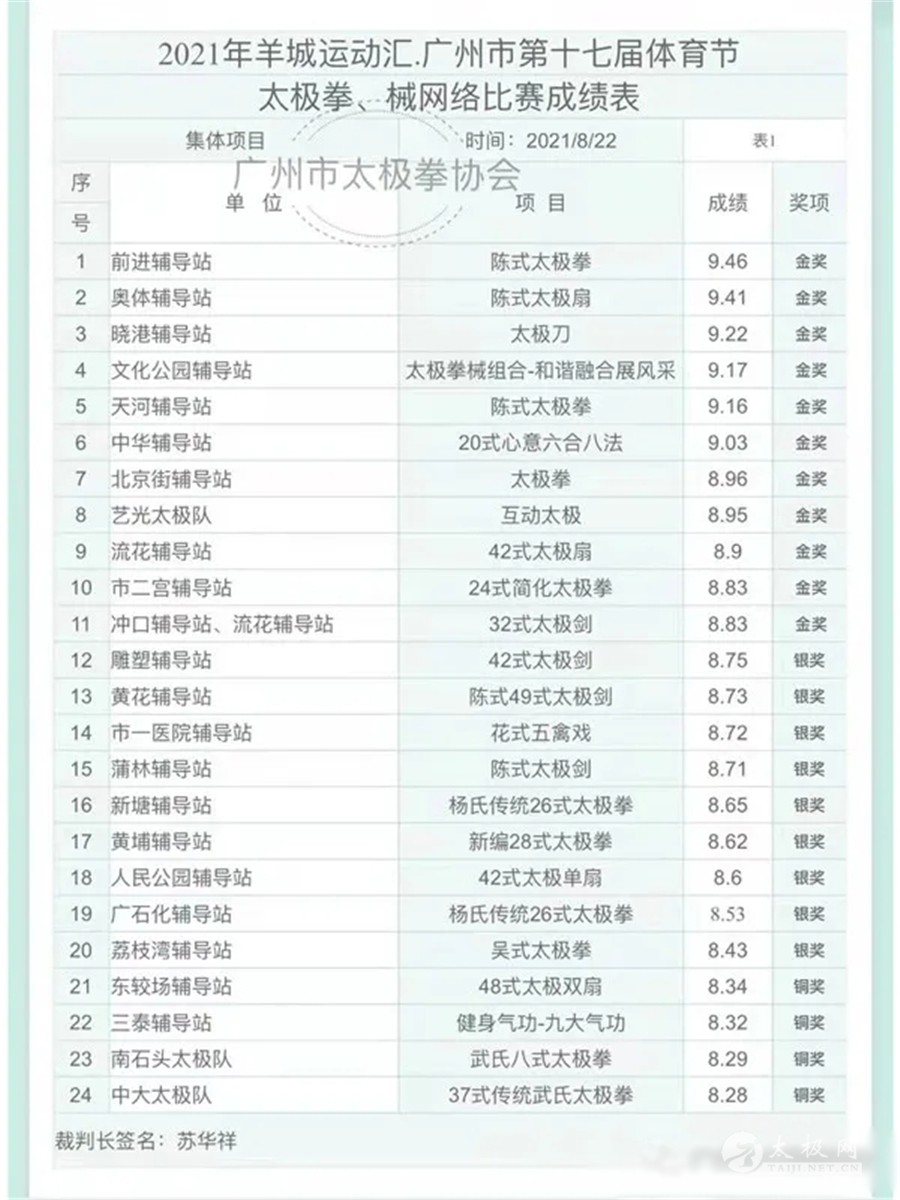 8月23日,广州市第十七届体育节太极拳线上赛展演活动评选结果出炉,前进辅导站等12个基层单位11个集体项目获金奖,雕塑辅导站等9个单位获得集体项目银奖,东教场辅导站等4个单位获得集体项目铜奖。 本次活动由广州市体育总会主办、广州市太极拳协会承办,指导单位是广州市体育彩票管理中心。活动主题为“全民健身与奥运同行”,是 2021年羊城运动汇•广州市第十七届体育节系列活动的重要组成部分。活动只设集体项目,各参赛单位提供节目视频参加线上展演评比。苏华祥、陈瑞兰、罗伟仪、伍英荣、陆锦文等五位协会资深老师担任裁判。 为适应当前疫情防控需要,积极落实市体育局有关通知要求,协会及时调整了太极拳展演活动的原有方案,改为线下+线上的方式进行, 为此专门制订了比赛规程和参赛细则。活动得到了各基层单位的积极响应,共有25个单位24个集体项目参与网上角逐。参赛内容丰富,涵盖太极拳、械及健身气功等。 协会通过举办太极拳、械集体项目线上展演活动,为各基层单位提供了相互学习、展示风采的崭新平台,在新冠疫情防控常态化情况下,用武术提振市民精神,用运动激发城市活力,努力营造全民参与太极健身的浓厚气氛。 供稿:广州市太极拳协会秘书组 本站编辑:李小 |