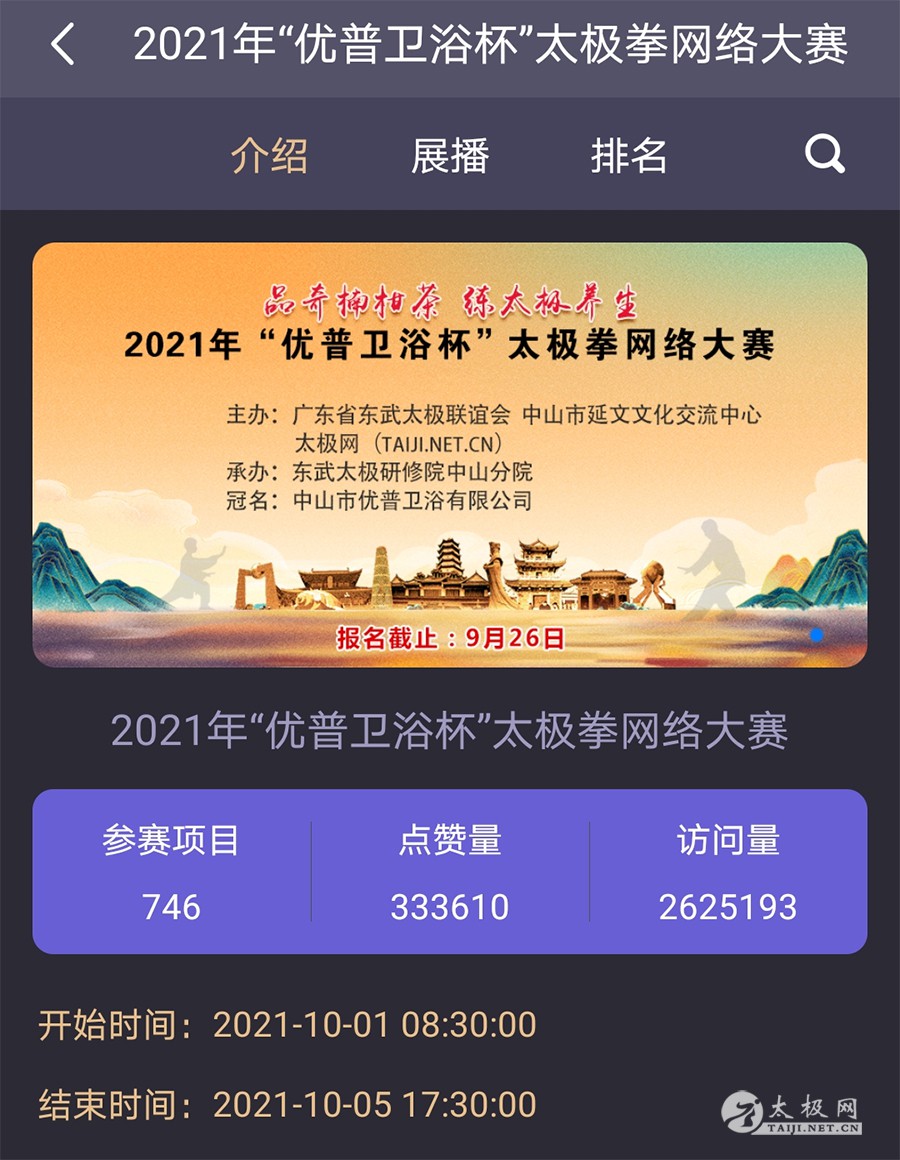 由广东省东武太极联谊会、中山市延文文化交流中心联合太极网发起组织,由中山市优普卫浴有限公司冠名赞助的“优普卫浴杯”太极拳网络大赛经过5天持续高能燃烧圆满收官。 大赛视频展播点赞环节从10月1日开始,截至10月5日17:30收官,平台累计网络访问量262.51万次,投票点赞33.36万次,广大拳友们互动留言频繁刷屏。赛事由选手线上报名、线下录制参赛视频、在线展播、在线投票、专家评审等环节组成。本次大赛报名经组委会严格审核通过,精选746部参赛作品,广大武术人踊跃互动交流,反响热烈。 本着"公开透明 客观全面 权威公正"的评审原则,在大赛展播点赞的网络基础上,组委会将邀请专业裁判员组成强大的评审阵容为大赛评审工作提供坚实保障,让大赛兼具观赏性和权威性。 大赛评审结束后统一公示成绩,届时大赛组委会还将发布本届大赛颁奖典礼等线下主题活动通知,敬请期待。 优普卫浴杯”太极拳网络视频大赛组委会 2021年10月 |