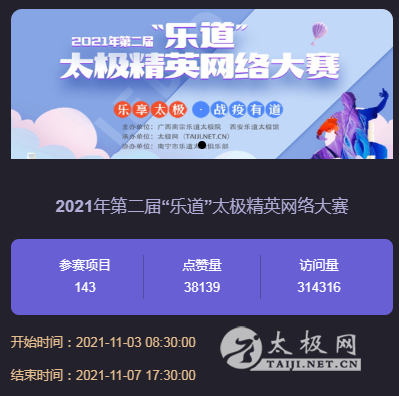 乐享太极·战“疫”有道!太极,以网会友!11月7日下午,由广西南宗乐道太极院、西安乐道太极馆主办,太极网(TAIJI.NET.CN)承办,南宁市乐道太极俱乐部协办,2021年第二届“乐道”太极精英网络大赛网络展播活动经过5天持续高能燃烧圆满收官。 大赛全体同台展播点赞从11月3日开始,截至7日17:30收官,平台累计网络访问量31余万次,投票点赞3.8余万次,广大拳友们互动留言频繁刷屏,连续5天燃爆太极人的朋友圈!互联网赋能“太极拳”的盛会充分彰显了太极拳的无穷魅力。 赛事延用“乐享太极·战‘疫’有道”的主题,由选手线上报名、线下录制参赛视频、在线展播、在线投票、专家评审、颁奖典礼等环节组成。共143部参赛作品,广大拳友踊跃互动交流,好评如潮。