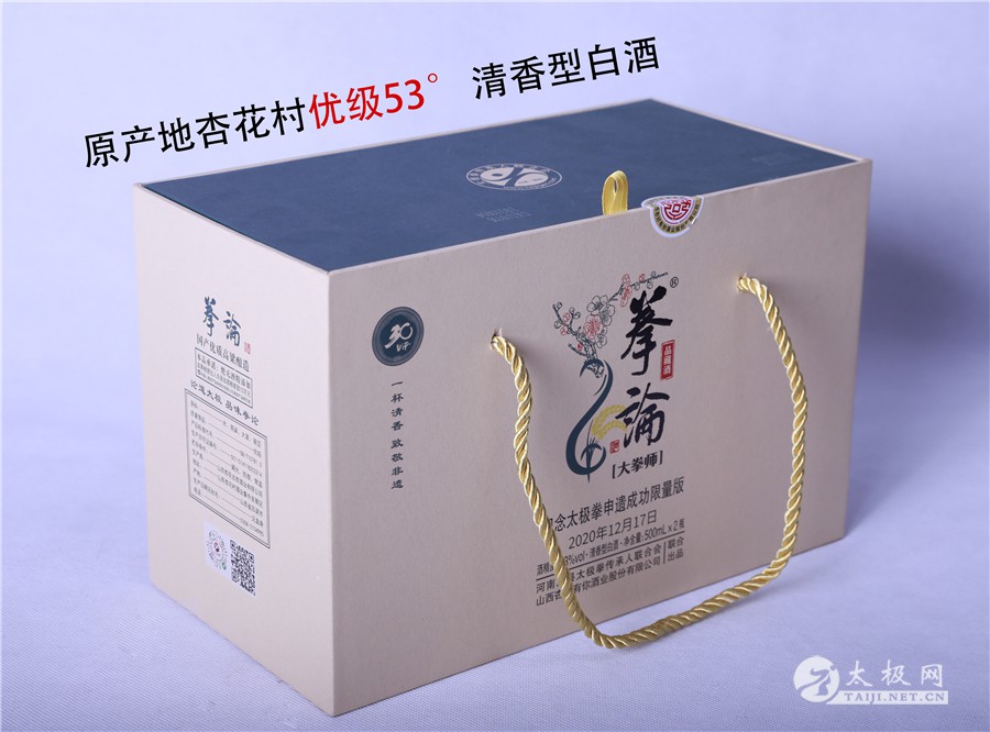 纪念太极拳申遗成功限量版2021坛封坛拳论酒(2588元/坛/5000ml)现正在火爆预售,同品质品藏版拳论酒(500ml/瓶)已同步上市并可即刻订购。拳论酒是创立于1997年的太极网携手山西杏好有你酒业股份有限公司联合出品的优级53度清香型白酒,在杏花村酒业集中发展区核心产地精选上等汾酒原浆,酒质对标X汾20年,并由中国人寿财险承保承诺:绝无酒精添加,如果检测出人为添加酒精奖励10万元! 为回馈长期以来关注和支持太极网的太极家人们,特推出钜惠福利:自即日起至2021年12月17日,即申遗成功一周年之际,下单购买品藏版拳论酒,可享首发钜惠价516元一盒两瓶!之后,我方将恢复市场价896元一盒两瓶发售。 为保障各方权益,截至2021年12月17日,已预订限量版封坛纪念酒的拳友可享受钜惠价购买品藏版拳论酒不限数量;未预定封坛纪念酒的拳友可享钜惠价限购一盒,品尝后满意如定购限量版封坛纪念酒,可在收藏价2588元基础上折抵减免516元,但不再额外赠送品藏版拳论酒。 限量版封坛纪念酒仅有2021坛,以太极拳申遗成功为主题的匠心定制,对于广大太极人拳极具收藏价值,唯一编号先到先得,坛体可定制纪念话语,尊享独立收藏证书,正可谓“藏美酒清香,享太极绵长”,欢迎拳友们预定。 同品质品藏版拳论酒因原浆有限,暂定出品1000箱,1箱/3盒/6瓶,是太极家人们聚会交友、开怀畅饮的上佳选择。创立于1997年的太极网向广大太极人品质承诺并倾情推荐,欢迎拳友们下单购买。 |
