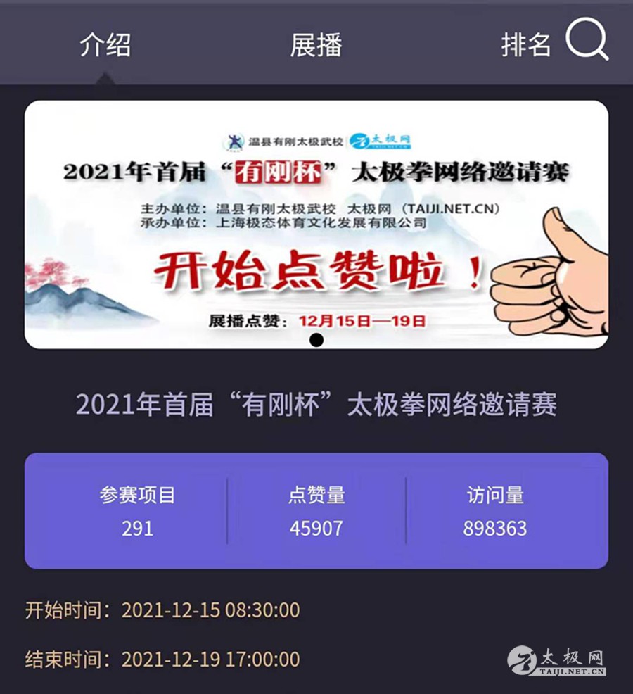 12月19日下午,2021年首届“有刚杯”太极拳网络邀请赛展播点赞环节经过5天持续高能燃烧精彩收官,展播点赞环节从12月15日开始,至12月19日17:00收官,组委会审核通过的291部优秀参赛视频作品同台竞技,平台累计网络访问量89余万次,投票点赞4.5余万次,广大拳友们互动留言频繁刷屏。 大赛从策划发起到报名至上线展播不足一月时间,但赛事规模和影响力不可小觑,是馆校体系主办太极网赛的典型成功案例。在有刚太极武校和陈有刚及陈小芹老师的的精心筹备和号召下,联合主办方太极网积极发挥平台和技术优势为赛事运营提供保障,各地武术组织和太极人积极响应,以网会友、以武会友,通过大赛平台一展太极风采、交流切磋,成为全民健身抗疫的一道亮丽风景线。 本着"公开透明、客观全面、权威公正"的评审原则,在大赛展播点赞的网络基础上,组委会将组建专业评审团为大赛评审工作提供坚实保障,让大赛兼具观赏性和权威性,夯实太极拳体系网赛的含金量和影响力。 大赛由温县有刚太极武校、太极网主办,上海极态体育文化发展有限公司承办,由深圳市光明区太极拳协会、大连理工大学太极拳协会、马鞍山陈氏太极拳协会、宁夏形真太极武馆、深圳市光明区旭东太极武术馆、极道太极推手精研社、漯河市太极功夫研究会、广东省广州市广唐书院、济源超然太极馆、世界陈小旺太极拳总会河南周口分会、国际陈有芹太极拳友俱乐部总会哈尔滨分会等联合协办。 据悉,本次大赛线下主题活动将视疫情择期举办。届时,除颁奖典礼外,广大拳友还可享优惠福利参与太极拳名家陈有刚老师的金牌推手培训班,作为拳界有口皆碑的名师,陈有刚老师的推手功夫和培训备受推崇,可谓机会难得,更多活动详情请关注太极网。 扫码观看参赛作品 “有刚杯”太极拳网络邀请赛组委会 2021年12月 |