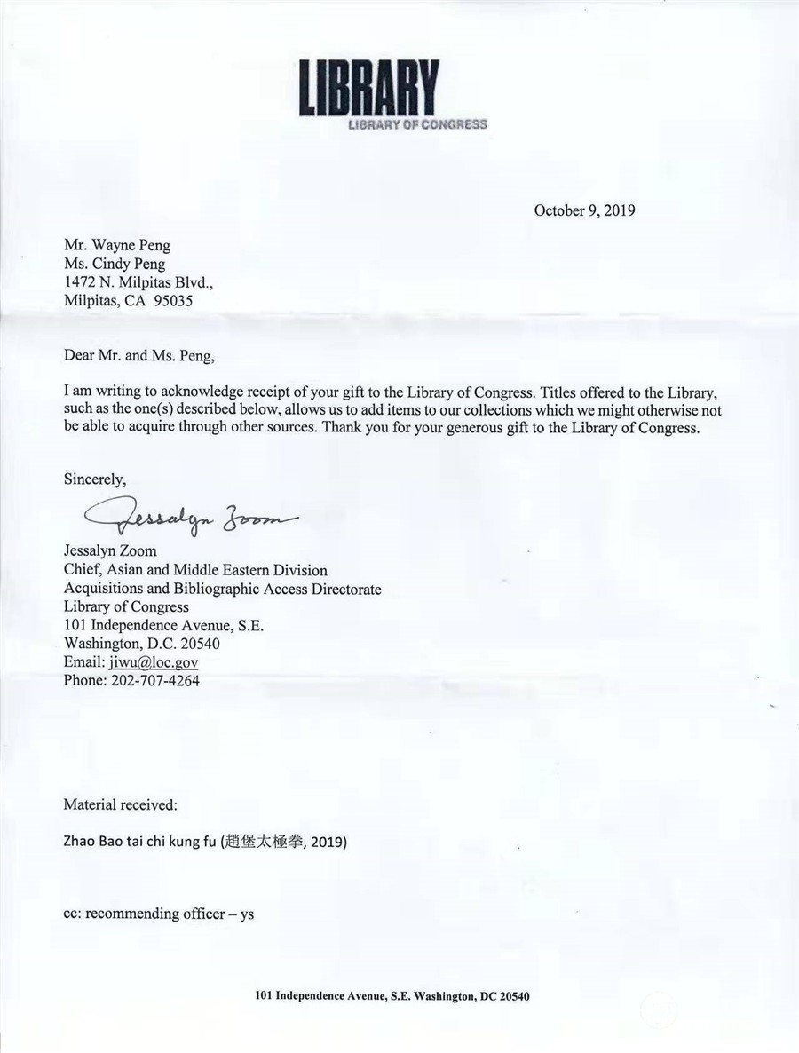 赵堡太极作为中国太极拳的重要流派之一,其拳姿雅静、飘逸如鹤;似行云流水,连绵不断;行拳以中、正、平、圆为基根,以松、静、顺为主导;五行八法贯穿其中,运动“速度”可快可慢、“动作”可大可小,“姿势”可高可低;长期坚持习练不但修炼内力,还可培养训练推手、散手、擒拿格斗及分筋错骨采手技术,防身自卫;健康身体,修心养性。 国际著名武打影星李连杰和吴京的师父、中国武术协会副主席吴彬大师祝贺新书面世 吴小高校长、鹰爪拳掌门刘莉莉大师、李连杰师父吴彬大师共同推荐赵堡太极新书 国际武道联盟创会主席加拿大梁守渝大师祝贺《赵堡太极拳》新书面世 美国《功夫太极》杂志创办人简琪女士祝贺《赵堡太极拳》新书面世 《功夫太极》杂志总编兼社长Gene Ching 祝贺《赵堡太极拳》新书面世 香港武打明星赵志凌先生祝贺新书面世 美国武术学院裴康凯院长祝贺新书面世 美国国会图书馆收藏信函 中英文双语《赵堡太极拳》新书已被美国国会图书馆收藏,国际著名武打影星李连杰和吴京的师父、中国武术协会副主席吴彬大师,世界著名武术教授白文祥大师,世界著名武术冠军、五十四枚金牌得主赵长军大师,世界著名太极拳冠军“太极女皇”高佳敏,美国《功夫》杂志创办人简琪女士和众多武术界名师以及加州众议员朱感生先生共同推荐此书,愿此书为广大的太极爱好者学习传统太极提供帮助,并为追求身心健康的人们带来益处。 作者:陆健 |