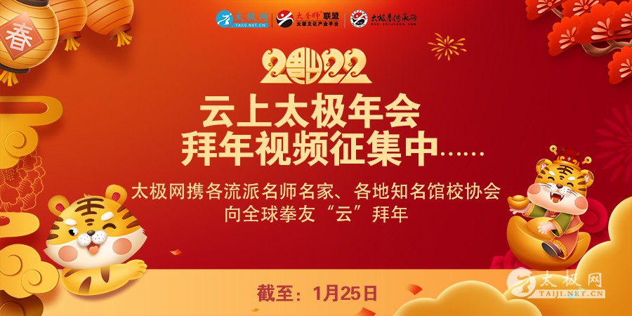 年关将至,值此辞旧迎新之际,太极网全体工作人员祝广大太极拳爱好者新春快乐,虎年大吉! 为积极响应抗疫号召,避免给社会增加防疫负担,太极网特此倡议各地太极拳组织举办“云上太极年会” ,做到不聚集、拳友情网上叙。同时太极网将提供公益宣传平台,为各地组织已经举办的太极年会活动提供免费宣传推广,向世界展示和传播优秀太极人与机构的风采面貌。 欢迎全球拳友共同参与太极拳“云”团拜活动,诚邀各流派太极拳名师名家、各地知名馆校协会“云”拜年。 一、征集内容 1. 年会新闻素材:各太极拳馆校、协会等组织的表演节目,年会活动相关图文视频等。 2. 2022拜年视频:2022年太极人拜年视频征集(视频稳定清晰,时长15秒左右),拜年内容样本(不限于):我是XXX,我代表XX(拳馆/组织)祝广大太极拳爱好者新年快乐,万事如意! 二、宣传推广 1. 新闻报道:针对组织质量较高的太极拳年会活动,太极网全媒体平台包含太极网微信公众平台免费进行公益宣传推广。 2. 年会视频:各组织年会精选视频将在“大拳师学堂”直播平台上进行展播推送 3. 拜年视频发布推广:太极网将对各流派太极拳名师名家、各地知名馆校协会等拜年视频进行专属剪辑包装并全网发布,最终还将制作全球太极人拜年合辑全网推广。