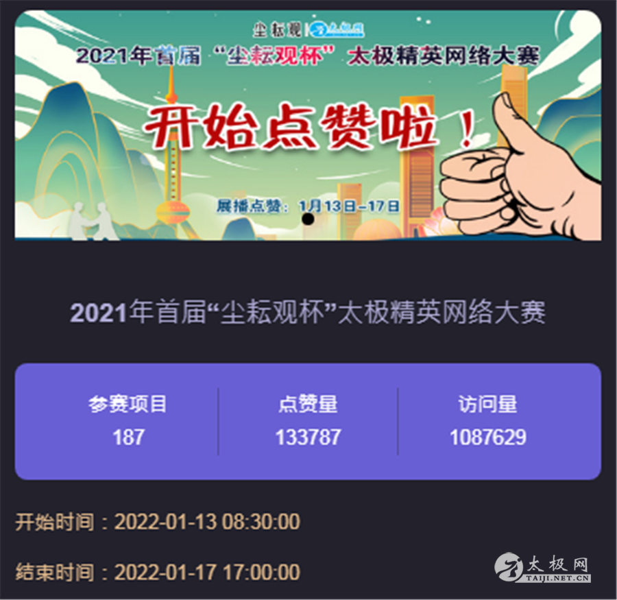为助力全球战疫,网庆太极拳申遗成功一周年,作为道家文化非遗传承代表的上海尘耘观非遗传承工作室联合太极网发起主办2021年首届“尘耘观杯”太极精英网络大赛,大赛通过搭建网络展播平台为广大太极拳提供太极风采展示和交互学习平台,以拳会友,共享非遗文化,共享健康。 本届大赛受到了全国各地太极拳爱好者的广泛关注,展播期间,广大拳友热情似火,燃爆这个冬日,在网上掀起了一股太极热潮。大赛同体全台展播5天,2022年1月13日8:30开启,1月17日下午5:00收官,平台累计网络访问量108余万次,投票点赞13余万次,广大拳友互动留言刷爆朋友圈! 本次赛事由选手线上报名、线下录制参赛视频、在线展播、在线投票、专家评审、颁奖典礼等环节组成。赛事报名经组委会严格审核通过,共精选187部参赛视频,千万拳友踊跃互动交流,反响热烈,好评如潮。 本着"公开透明、客观全面、权威公正"的评审原则,在大赛展播点赞的网络基础上,组委会将邀请专业裁判员组成强大的评审阵容为大赛评审工作提供坚实保障,让大赛兼具观赏性和权威性。 大赛评审结束后统一公示成绩,届时大赛组委会还将发布本届大赛颁奖典礼等线下主题活动通知,敬请期待。