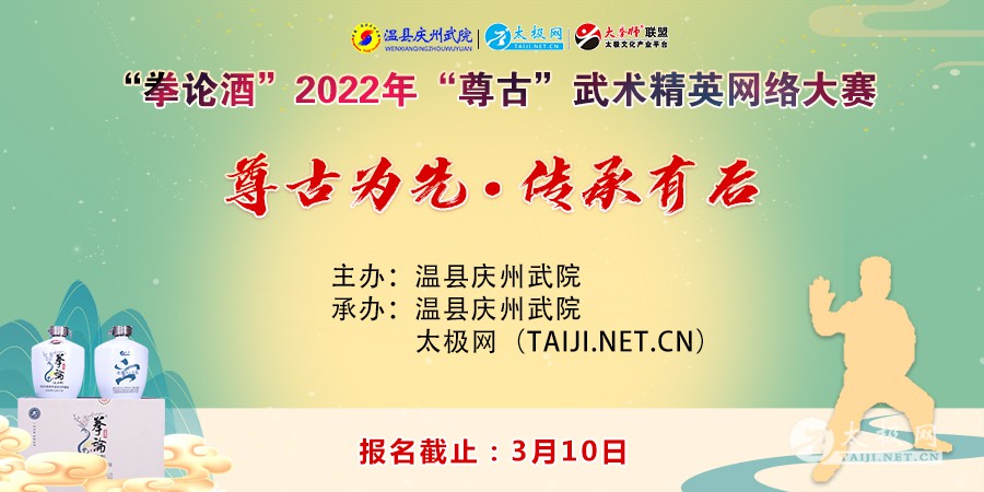 尊传统,沐古风,弘扬传武精神,树立文化自信。为弘扬传统武术精神,传承武术精髓,由温县庆州武院、太极网发起,联合各大武术流派举办2022年“尊古太极”武术精英网络大赛,共同开启虎年武术网赛第一站。 继2020年、2021年连续两届成功举办“尊古”太极精英网络大赛,2022年秉持初心,创新发展,贴合实际,第三届“尊古”武术精英网络大赛将融合太极拳与其他各大流派武术,呈现一场同台竞技,精彩纷呈的武术盛事。 “尊古”作为一种传统的武学思想,在“全民健身,健康中国”时代大背景下,尊古太极体系以更加包容,更加开放的姿态欢迎武术爱好者共同参与,聚焦本次赛事,交流切磋、探讨研究,传播尊古武学正能量。 本次比赛由“拳论酒”冠名举办,凡是参赛的拳友每人获赠100元“拳论酒”优惠券,可用于直接抵扣购买尊古定制“拳论酒”,团队团购有优惠政策,具体细节联系大赛组委会。 赛事以“尊古为先·传承有后”为主题,依托“互联网+武术”传播手段,创新武术传播模式,既是对“尊古”太极体系发展每年一度的网络“大阅兵”,更是通过集中展示扩大尊古武学思想影响力的最佳平台。 春暖花开日,诚邀广大传统武术爱好者煮酒论英雄。趁当下,录制武术视频留影纪念,与千万拳友在线交流PK,一起学习进步,岂不快哉! “拳论酒”2022年“尊古”武术精英网络大赛竞赛规程 一、活动组织 主办单位: 温县庆州武院 承办单位: 温县庆州武院 太极网(TAIJI.NET.CN) 支持单位: 温县文化广电和旅游局 温县太极拳武术文化管理中心 温县非物质文化遗产保护中心 协办单位: 二、活动时间 1. 报名和视频接收:2月6日至2月28日。 2. 大赛全体同台展播及网络投票:3月1日-5日。 3. 专家评审及成绩公布:4月份。 4. 颁奖典礼活动择期举行。 三、参赛对象 各流派武术组织及个人爱好者。 四、竞赛项目 (一)拳术类 各流派武术传统套路 (二)器械类 太极传统器械及其他武术器械 (三)搿格手项目 太极拳用法展示(包含掤捋挤按採挒肘靠) (四)集体项目:拳术类、器械类、拳械混编。 五、竞赛规则 (一)本次比赛采用中国武术协会审定的2012版《传统武术套路竞赛规则》及有关补充规定。 (二)项目要求:所有项目要求为完整套路,不得增减动作、不得改变动作顺序,集体项目要求6人以上。 (三)时间规定: 1. 太极拳套路 一路完成套路时间15分钟以内,二路、尊古一段及其他套路3~4分钟; 2.太极器械 单剑时间3~4分钟,单刀不低于1分钟,其他项目2~4分钟。 3. 其他流派武术传统套路时间不限。 4. 集体项目时间不超过4分钟。 (四)年龄分组: 儿童组:12岁及以下; 少年组:13至17岁; 青年组:18岁至39岁; 中年组:40岁至60岁; 老年组:60岁以上。 六、参赛影像要求 1. 参赛作品要求为参赛者本人近期演练的视频影像。 2. 视频要求清晰流畅,图像稳定。参赛视频质量差或不符合标准的,谢绝参赛,报名费不退。参赛作品一经提交发布,更换或更改参赛视频费用为100元/项。 3. 因赛事标准统一和宣传,组委会有权对参赛视频进行剪辑并添加片头片尾,并体现参赛个人和所属组织,同时对不符合要求的视频片头片尾进行修改调整。 4. 凡有悖社会公德或含有违反相关法律规定的图文影像将被取消参赛资格;画面禁止包含他人权利的商标标识、商业招牌、广告植入等。 5. 参赛者提供的视频版权、肖像权自负,主办方不承担因参赛作品导致的包括但不限于肖像权、名誉权、隐私权、著作权、商标权等纠纷而产生的法律责任。