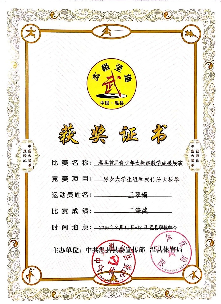 王翠娟 为积极挖掘、表彰、宣传每年度在太极拳传播推广领域表现突出的传承人、拳师,太极网·大拳师联盟连续多届发起举办“太极网传播盛典年度表彰活动”。 2021年度获奖名单隆重推出,和式太极拳第七代传人王翠娟荣膺2021年度十大“太极杰出青年”称号。 王翠娟 王翠娟,和式太极拳第七代传人,师承和有禄。现任黄河交通学院公共体育部专职体育教师。 王翠娟 王翠娟老师,1988年出生于河南省濮阳市清丰县,自幼对中华传统文化太极拳有着浓厚的兴趣;2014年,在太极拳的发源地温县初次接触到和式太极拳十八式,便被和式太极拳魅力所吸引,深深喜欢上了这套轻灵圆活、顺遂自然的拳法;2016年,再次奔赴温县,系统性地学习和式太极拳、太极棍;2016年和2019年,在参加河南省高校教师和式太极拳培训过程中,有幸得到和有禄老师的指点,拳技有了长足的进步;2020年11月,正式拜入和有禄老师门下,成为和式太极拳第七代传承人,自此便时刻以传承人的身份要求自己,深耕太极技艺,潜心钻研拳理,日日精进,内外兼修。 王翠娟 王翠娟老师自2015年在黄河交通学院担任体育教师起,便致力于太极拳在大学校园的传播和发展,面向全校大一、大二学生教授太极拳,现累计授课人数已达400余人;在学院建党百年庆典晚会上,与陈志鑫师兄一起编排了节目《和风雅韵》,进行和氏太极拳的宣传;并于2021年,根据自己多年的习拳授拳经验,编写图书《太极拳运动健身指导》(预计2022年出版发售),借用文字的形式让太极拳在大学校园内更好的传播,为太极拳的发展和传播贡献自己的力量。 王翠娟 荣誉经历: 2016年,荣获温县首届暑期太极拳比赛大学生组和氏传统太极拳二等奖、和氏传统太极棍二等奖; 2018年,荣获河南省优秀教练员; 2020年,荣获黄河交通学院课程思政优秀教师; 2021年,荣获黄河交通学院最美教师; 2021年,荣获焦作市社科人才库专家。 王翠娟 王翠娟老师在接受采访时表示,荣获太极网十大“太极杰出青年”既是荣誉更是责任担当。并表示在新的一年中将继续努力奋进,争取创造新的辉煌,为弘扬传统文化、传承武术精神做出应有的贡献! |