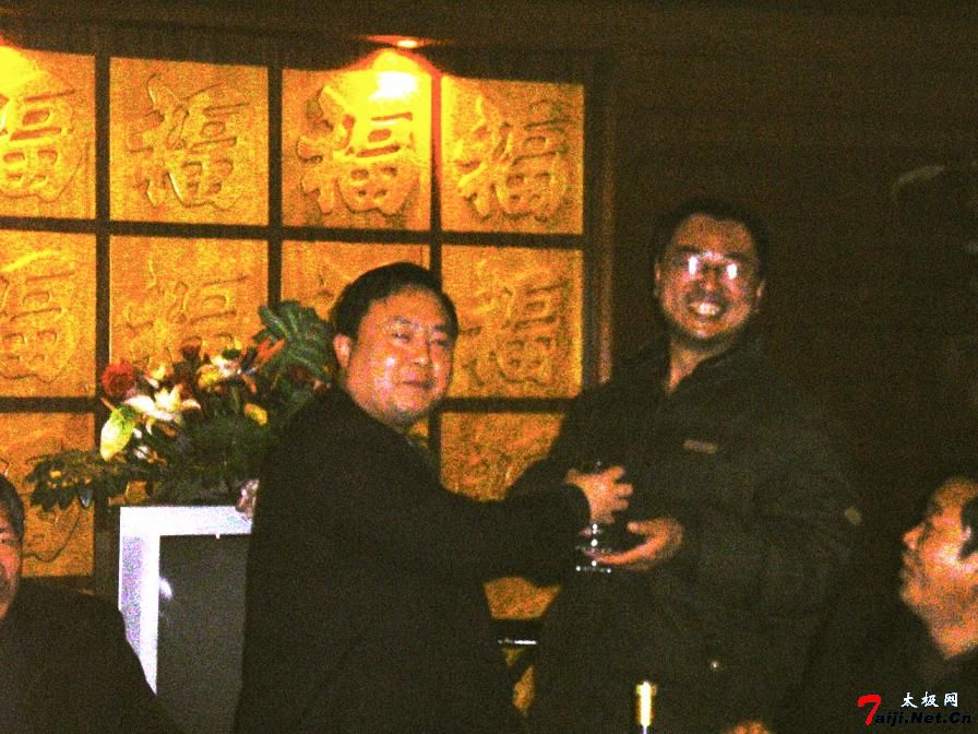 2007年3月4日(阴历正月十四),河南焦作槐园太极拳社社长陈骁伍先生,在秋水大酒店设宴招待陈家沟老村长张蔚珍先生,支书陈皂罗先生以及副支书等一行。一同前来的还有陈家沟太极拳推广中心秘书长原福全先生,太极网总经理刘洪奇先生。 席间,大家共同探讨了太极拳界的现状以及未来的发展合作,对太极拳事业的未来充满希望。
