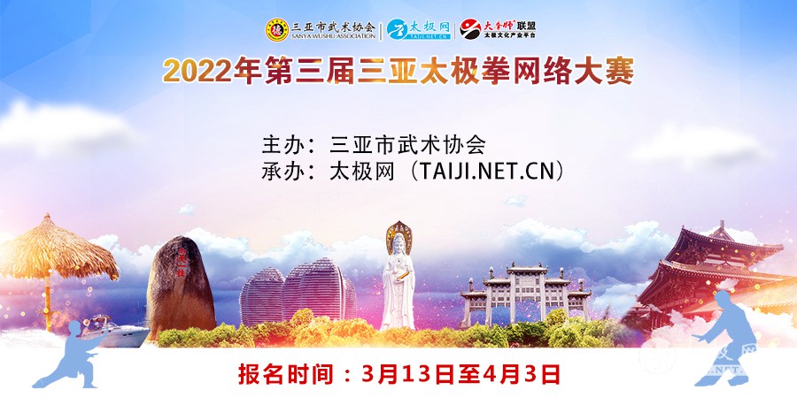 太极拳,作为中国传统优秀文化的杰出代表和人类非物质文化遗产,已风靡全球。2021年三亚市武术协会与太极网联合举办的第二届三亚太极拳网络大赛,参赛规模空前,创造了武术网赛的新高度、新纪录,参赛视频项目3500余项,参与人数更是超过4000人,平台5天展播累计网络访问量2000余万次,投票点赞300余万次,这场太极网赛从三亚燃向全国,世界各地拳友在赛事中展示太极魅力! 在广大太极拳爱好者的强烈期盼中,2022年第三届三亚太极拳网络大赛再度扬帆起航。依托“互联网+太极拳”传播手段,创新太极拳赛事模式,为广大太极人搭建以网会友、以武会友的交流切磋平台。赛事由报名、录制参赛视频、在线展播及投票、专家评审、颁奖典礼等环节组成。现将具体通知如下: 2022年第三届三亚太极拳网络大赛 竞赛规程 一、活动组织 主办单位:三亚市武术协会 承办单位:太极网(TAIJI.NET.CN) 协办单位:澳大利亚武术委员会 二、活动时间 1. 报名和视频接收:即日起至4月3日。 2. 大赛全体同台展播及网络投票:4月6日-10日 3. 专家评审及成绩公布:5月份。