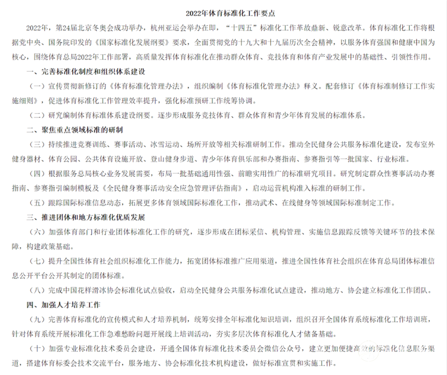 国家体育总局网站发布《2022年体育标准化工作要点》的通知,其中明确提到,推动武术、在线健身等领域国际标准制定工作。 通知要求,要宣传贯彻新修订的《体育标准化管理办法》,组织编制《体育标准化管理办法》释义。配套修订《体育标准制修订工作实施细则》,促进体育标准化工作管理效率提升,强化标准预研工作统筹协调。研究编制体育标准体系建设纲要。逐步形成服务竞技体育、群众体育和青少年体育发展的标准体系。 同时,还将聚焦重点领域标准的研制。持续推进竞赛训练、赛事活动、冰雪运动、场所开放等相关标准研制工作。推动全民健身公共服务标准化建设,发布室外健身器材、体育公园、公共体育设施开放、登山健身步道、青少年体育俱乐部和办赛指南、参赛指引等一批国家、行业标准。 通知还要求,根据服务总局核心业务发展需要,布局一批基础通用性强、前瞻实用性广的标准研究项目。研究制定群众性赛事活动办赛指南、参赛指引编制模板及《全民健身赛事活动安全应急管理评估指南》,启动运营机构准入标准的研制工作。完善体育标准化的宣传模式和人才培养机制,统筹安排全年标准化知识培训,组织召开全国体育系统标准化工作培训班,针对体育系统开展标准化工作急难愁盼问题开展线上培训活动,夯实多层次体育标准化人才储备基础。 来源:微武术 责编:李晓 |