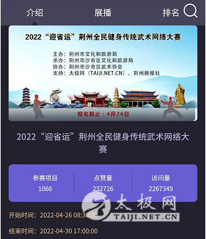 4月30日下午5时整,由荆州市文化和旅游局主办、荆州市沙市区文化和旅游局承办,荆州市沙市区武术协会协办,荆州晚报社和太极网支持的2022“迎省运”荆州全民健身传统武术网络大赛经过5天网络展播持续高能燃烧圆满收官。 本届赛事从策划到组织得到了荆州市文化和旅游局及全国各地太极拳组织的大力支持,自报名启动至上线展播仅一星期时间,即有千人参与大赛,受到了广大拳友和团队的积极响应和参与,最终经组委会审核通过,1066部参赛作品入选展播,受到拳界广泛肯定和赞扬。 大赛全体同台展播点赞从4月26日开始,截至30日17:00收官,平台累计网络访问量226余万次,投票点赞23余万次,广大拳友们互动留言频繁刷屏,连续5天燃爆武术人的朋友圈,互联网赋能荆州武术网赛成为拳圈一道亮丽的风景线。 本着"公开透明、客观全面、权威公正"的评审原则,在大赛展播点赞的网络基础上,组委会将邀请专业裁判员组成强大的评审阵容为大赛裁判工作提供坚实保障,让大赛兼具观赏性和权威性。 大赛评审结束后统一公示成绩,届时大赛组委会还将发布本届大赛颁奖典礼等线下主题活动通知,敬请期待。 “迎省运”荆州全民健身传统武术网络大赛组委会 2022年4月 |