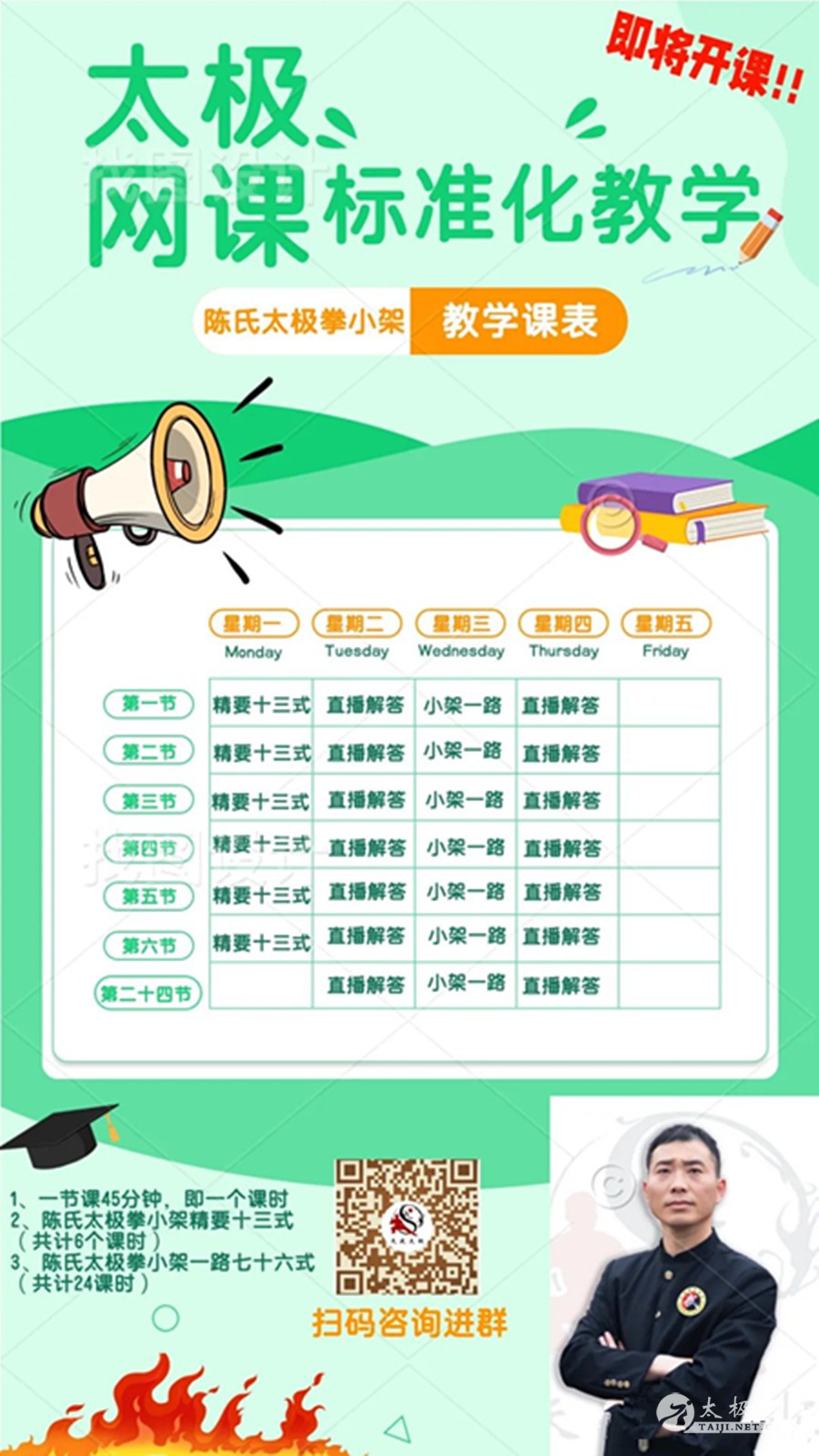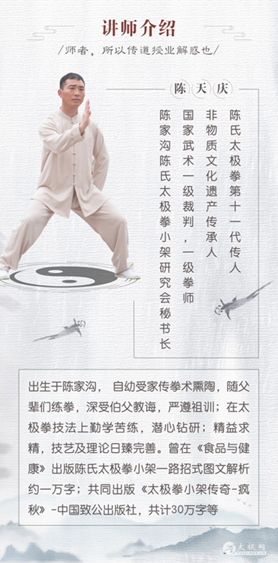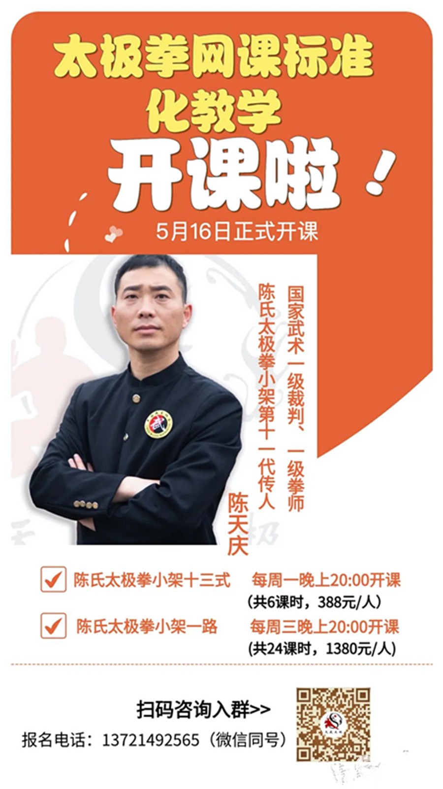 疫情当下,响应国家的号召,同时陈天庆师傅潜心研究沉淀多年的《标准化陈氏太极课程》已新鲜出炉。“口罩时代”的我们是幸运的,为了方便大家的理解,形成了Q&A来讲解给大家~~ 1、陈老师,这个课程是在公众平台教学吗?什么样子的形式呢? 回答:本次课程是小班付费直播教学。微信群组成班级,腾讯会议直播教学。 2、本次标准化教学课程都包含哪些?可以具体说下吗? 回答:本次开课有两门课程。分别为陈氏太极拳小架精要十三式,陈氏太极拳小架一路。后续还有深入太极课程带着大家开启网络太极之路,大家可以期待下~不过我们还是需要一步一个脚印的学习哦! 陈氏太极拳小架精要十三式,共6课时,每周一晚上20点开课,每节课45分钟 陈氏太极拳小架一路,共24课时,每周三晚上20点开课,每节课45分钟 为了回馈各位拳友,在母亲节来临之际,凡本次购买课程的均会赠送原价840元的武术礼仪与太极拳小架理论知识讲解,以及基本功的基础训练课程(开班即生效) 3、陈老师,我报了课程,我是太极小白,担心自己在规定课时内学不会,怎么办? 回答:陈天庆师傅是根据自己多年的实战经验,专门为零基础,或者对太极有初步了解的人制定的这两门课程,零基础无门槛,只要跟着师傅的教学计划走都是可以学会的 。在学习的过程中,如果有不理解的,可以咨询师傅。同时师傅会在每周二、四直播统一回答大家的问题做以示范。 培训老师:陈天庆师傅 报名电话:13721492565(同微信) 【培训老师-北京天庆太极院总教练 陈天庆】 “陈氏太极器械十三刀”全程由陈氏二十世、太极拳第十一代传人、国家一级裁判、国家一级拳师、北京天庆太极院创始人、陈氏太极拳小架研究会秘书长陈天庆老师亲自执教。