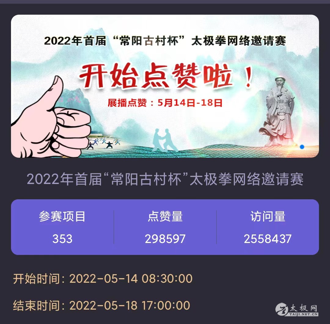 5月18日下午,由陈家沟太极拳武校和太极网联合发起主办的2022年首届“常阳古村杯”太极拳网络邀请赛经过5天网络展播持续高能燃烧圆满收官。 2022年的当下,战“疫”仍然是全球的主旋律,太极拳在非常时期的抗疫防护作用受到社会和官方的高度认可。为适应当前疫情防控需求,同时响应国家体育总局关于居家科学健身、举办网络赛事的号召,通过搭建太极拳网络交流赛事平台,弘扬传播太极文化。由陈家沟太极拳武校联合太极网发起组织的2022年首届“常阳古村杯”太极拳网络邀请赛正式启动。赛事依托“互联网+太极拳”传播手段,创新太极拳传播模式,既是对陈家沟太极拳武校及各地分支机构发展的一次网络“大阅兵”,更是扩大体系影响力的良好契机。 弘扬人类非遗太极拳,核心是对传统文化和技艺的坚守与传承,不忘根源和初心。太极拳发源地温县陈家沟村原名“常阳村”,太极拳的诞生、演变和发展由此薪火传承,世代绵延。本次邀请赛冠名“常阳古村杯”,旨在致敬历史,尊崇传统,更在对太极文化薪火传承的宣扬。 大赛的策划和组织得到了太极拳发源地温县相关单位及各地太极拳组织和广大武术爱好者的大力支持,自报名启动至展播期间,受到了广大拳友和团队的积极响应和参与,最终经组委会审核通过,353部参赛作品入选展播,受到拳界广泛肯定和赞扬。 大赛全体同台展播点赞从5月14日开始,截至18日17:00收官,平台累计网络访问量255余万次,投票点赞近30万次,广大拳友们互动留言频繁刷屏,连续5天燃爆太极人的朋友圈,互联网赋能太极拳成为武术圈一道亮丽的风景线。 本着"公开透明、客观全面、权威公正"的评审原则,在大赛展播点赞的网络基础上,组委会将邀请专业裁判员组成强大的评审阵容为大赛裁判工作提供坚实保障,让大赛兼具观赏性和权威性。 大赛评审结束后统一公示成绩,届时大赛组委会还将发布本届大赛颁奖典礼等线下主题活动通知,敬请期待。