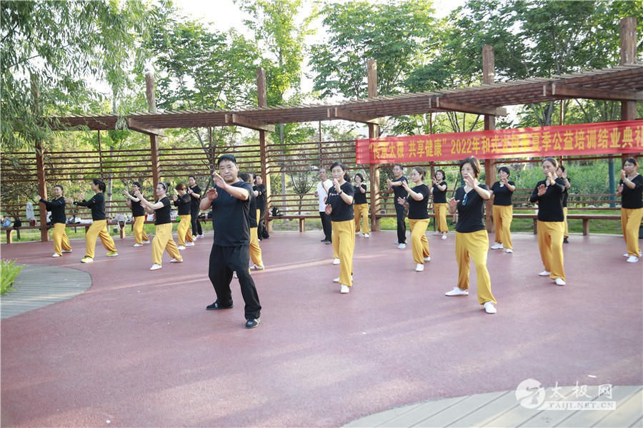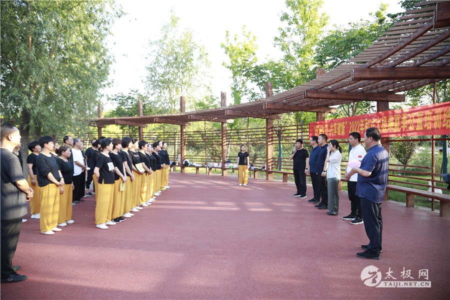 万瓦鳞鳞若火龙,日车不动汗珠融。2022年6月18日,和式太极拳公益培训班结业仪式在温县子夏公园隆重举行。温县县委常委、宣传部部长史玉龙,县人民政府副县长王欢欢,县政协副主席严双军,县太极拳武术文化管理中心主任任海林、副主任刘高杰,和式太极拳学会会长和有禄等领导和嘉宾出席结业仪式。 据了解,本次公益培训活动受到了温县县委、县政府的大力支持,温县太极拳武术文化管理中心及和式太极拳学会做了大量的筹备工作,培训活动为期20天,参训人员在以王武为首的教练团队的精心指导下,圆满地完成了本次培训的各项教学任务。 结业仪式上,县人民政府副县长王欢欢致辞,她表示本次和式太极拳公益培训的成功举办对于县非遗文化的继承和弘扬起到了积极的推动作用,并希望学员们可以继续秉持培训期间学习的动力,不断充实、提升自己,为温县太极拳事业的发展做出积极的贡献。 和式太极拳学会会长和有禄致答谢辞,他向关心和支持本次公益培训活动的县委、县政府领导表示感谢,向为本次公益培训付出辛苦努力的教练团队表示感谢,并对学员们认真刻苦的学习精神表示赞扬,希望大家可以响应县委、县政府的号召,积极助推太极拳文化的传播和推广。 优秀学员代表朱菊梅发言表示,将会不负县委、县政府的号召,不负县武馆中心、和式太极拳协会的期待,不负努力,不负自己,将自己在本次培训中的所学所得运用到日后太极拳的宣传推广中,为太极拳事业的发展贡献绵薄之力。 参训学员们用20天的刻苦学习,认真训练收获了优秀学员的荣誉,获得了赞美。相信每一位从这里结业的学员们定能迅速成长,为温县和式太极拳事业的蓬勃发展贡献力量! |